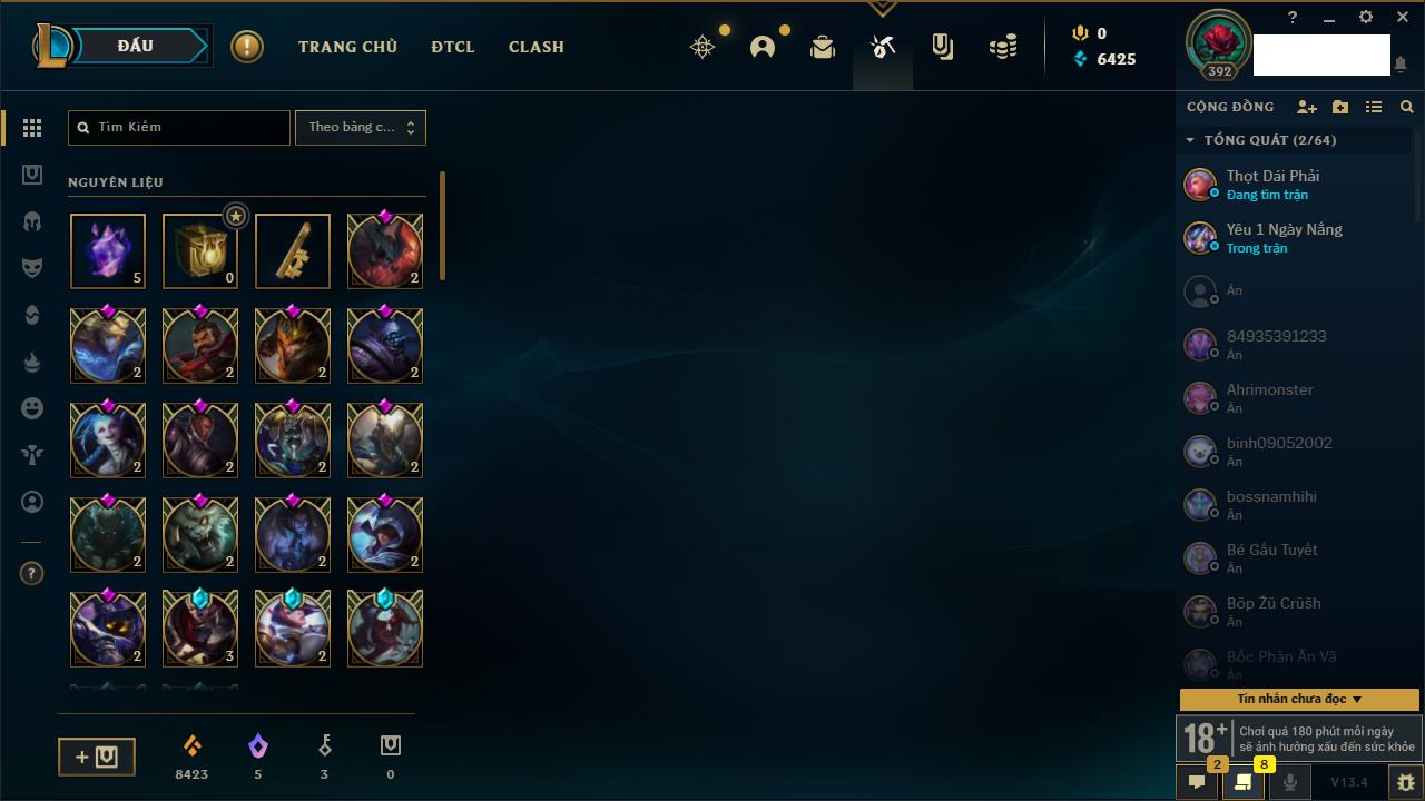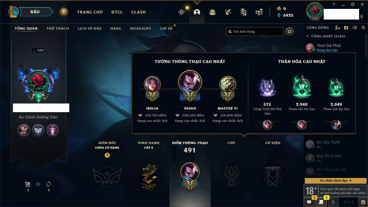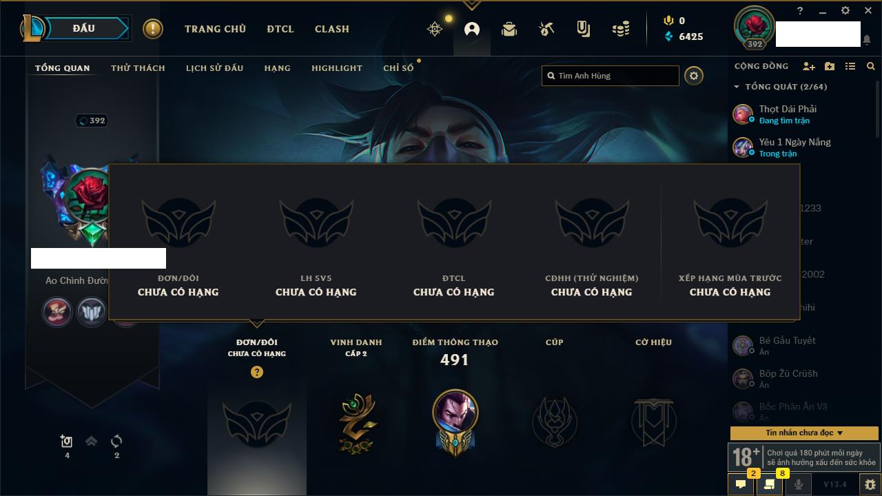 Rank Đơn: Đồng IIKhung: Chưa có khungTướng: 170 - Còn 56487 THXTrang Phục: 90Rank ĐTCL: Chưa RankLinh Thú: 129