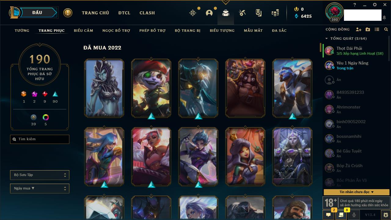 Rank Đơn: Vàng IIIKhung: VàngTướng: 170 - Còn 33222 THXTrang Phục: 136Rank ĐTCL: Chưa RankLinh Thú: 40