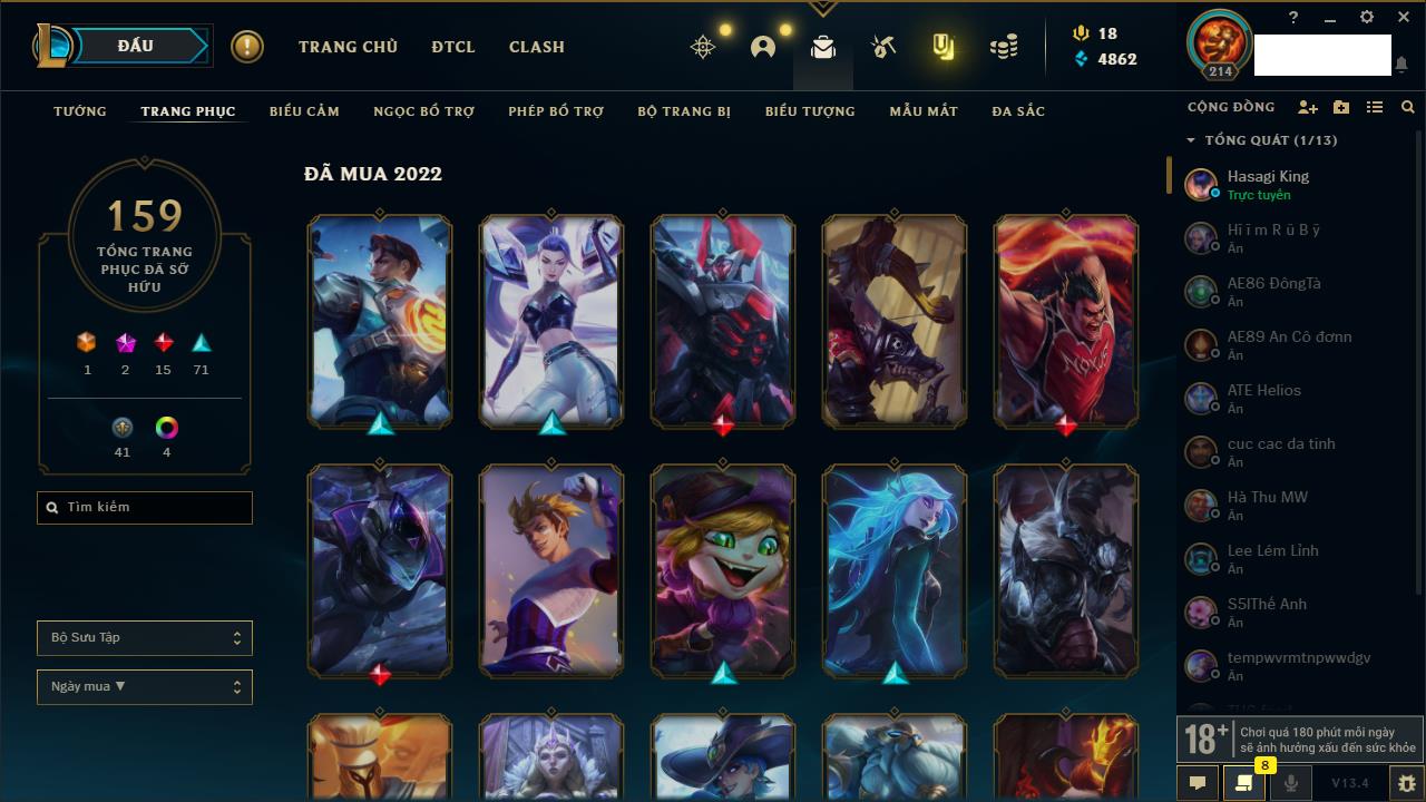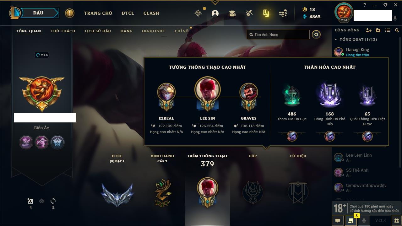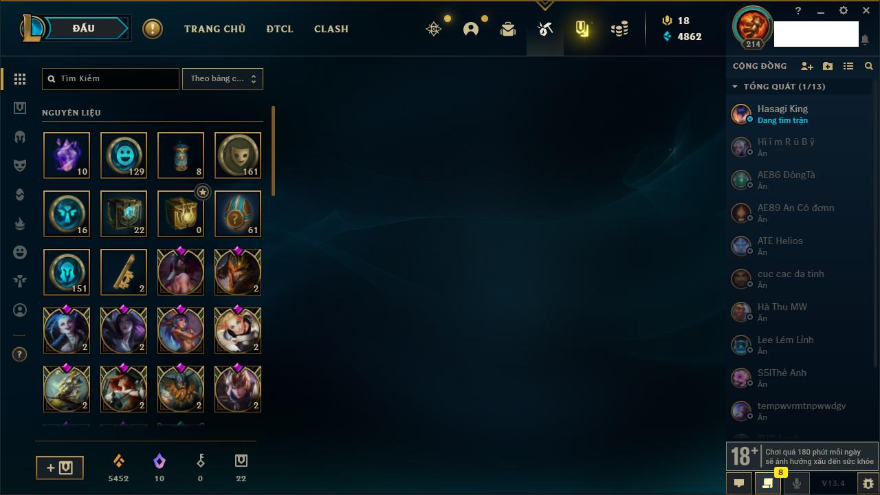 Rank Đơn: Vàng IVKhung: BạcTướng: 171 - Còn 426239 THXTrang Phục: 162Rank ĐTCL: Chưa RankLinh Thú: 33