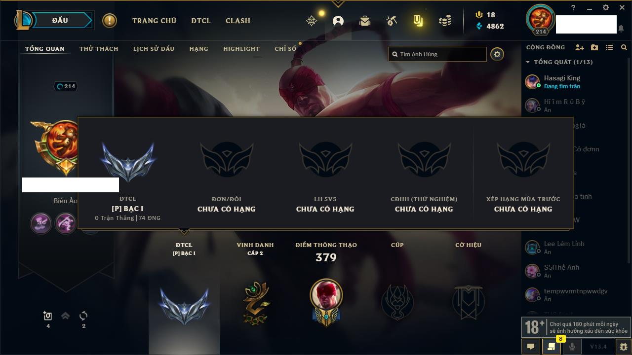 Rank Đơn: Bạc IIKhung: VàngTướng: 171 - Còn 332462 THXTrang Phục: 165Rank ĐTCL: Kim Cương IVLinh Thú: 181