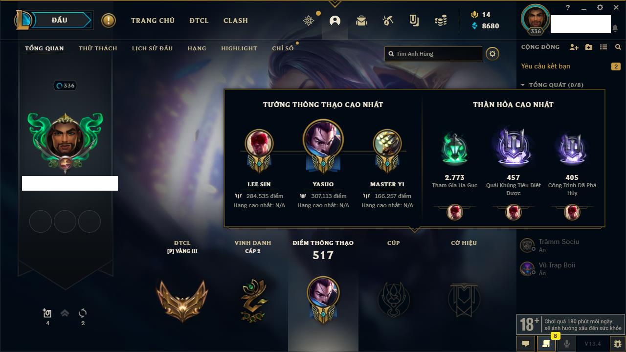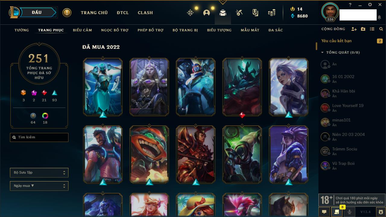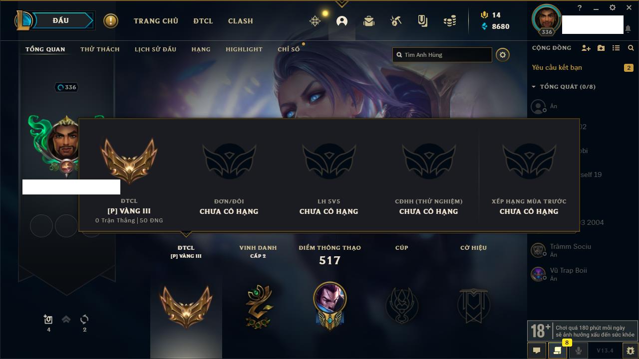 Rank Đơn: Vàng IIIKhung: BạcTướng: 171 - Còn 101359 THXTrang Phục: 88Rank ĐTCL: Kim Cương IVLinh Thú: 200