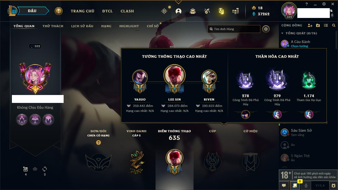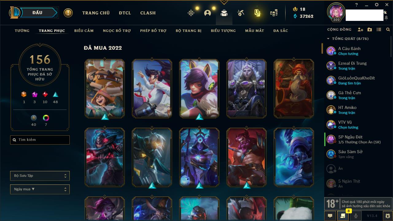 Rank Đơn: Chưa Rank Khung: Chưa có khung Tướng: 171 - Còn 52162 THX Trang Phục: 78 Rank ĐTCL: Chưa Rank Linh Thú: 145