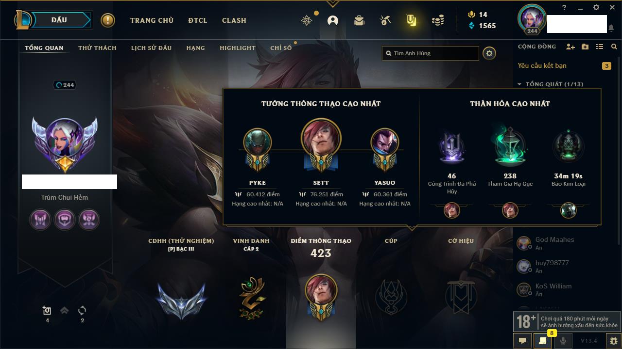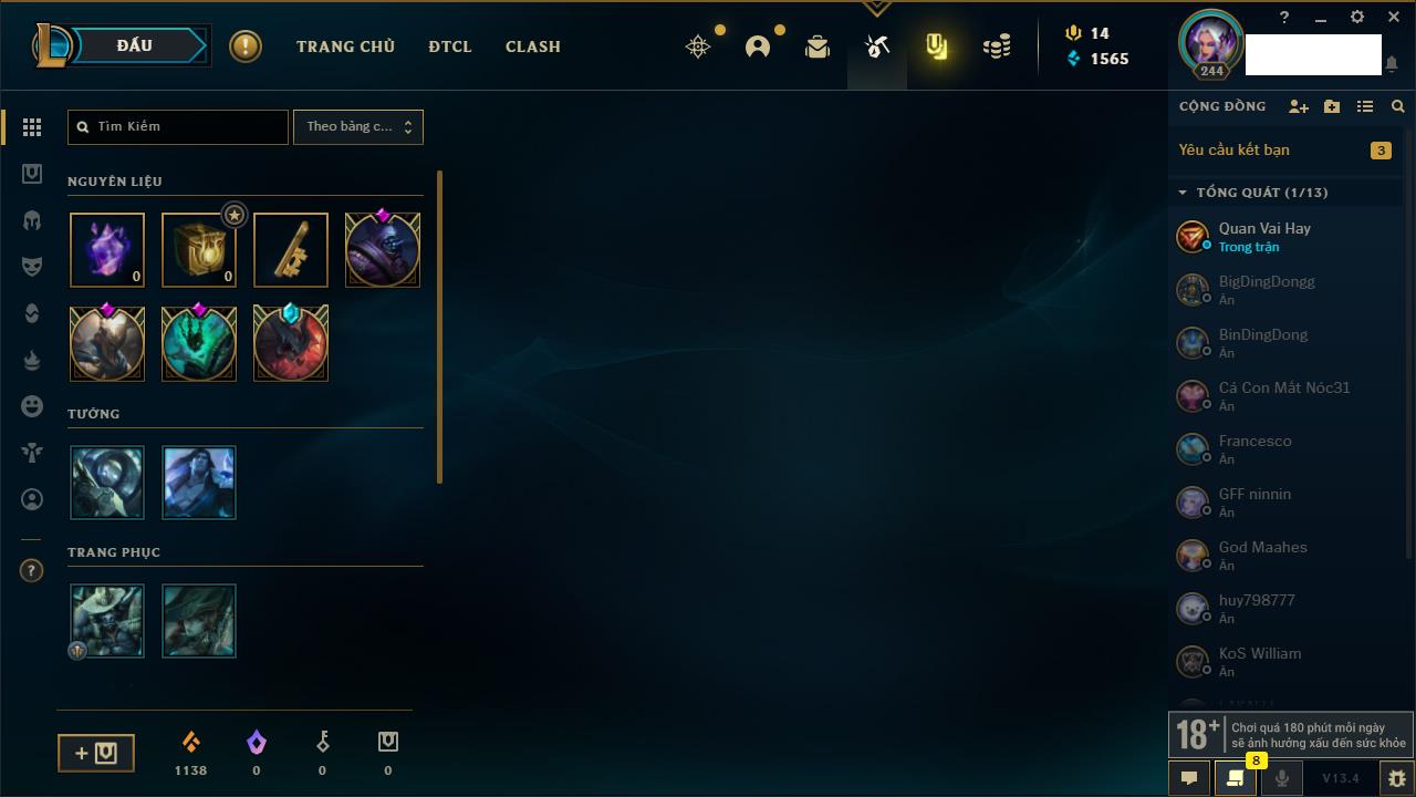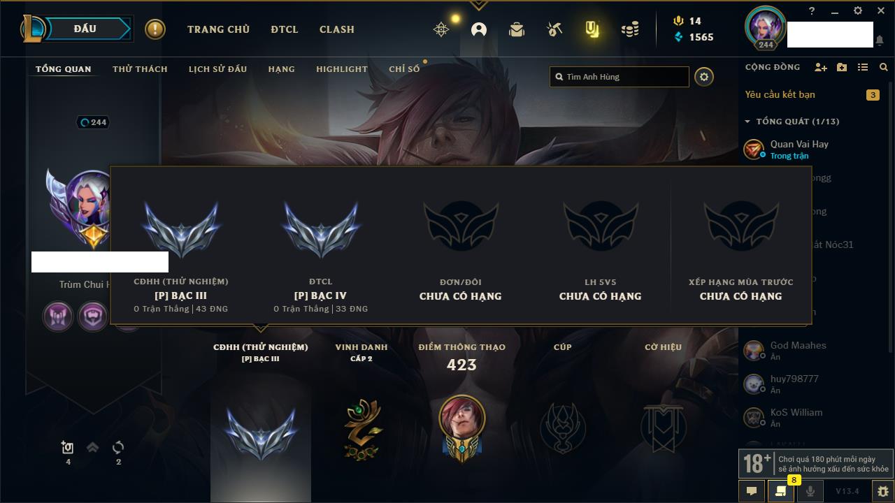 Rank Đơn: Chưa rank mùa nàoKhung: Chưa có khungTướng: 8 - Còn 13950 THXTrang Phục: 0Rank ĐTCL: Bạch Kim IVLinh Thú: 14