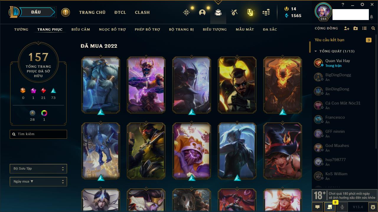Rank Đơn: Chưa RankKhung: Chưa có khungTướng: 166 - Còn 17966 THXTrang Phục: 188Rank ĐTCL: Chưa RankLinh Thú: 25