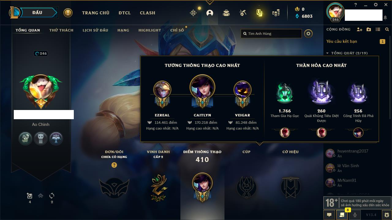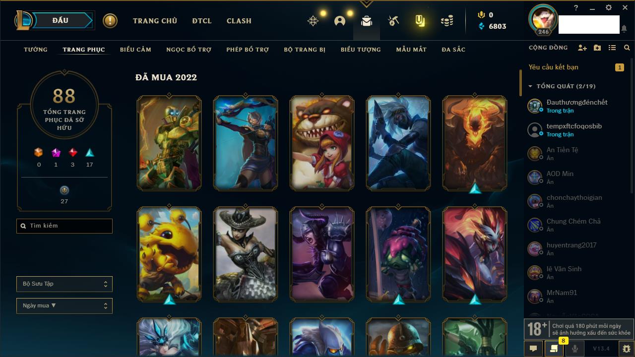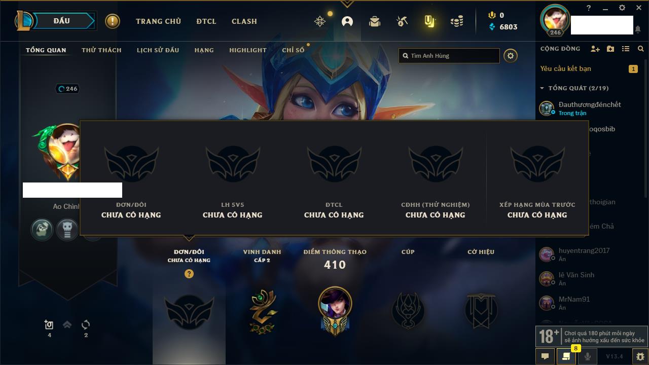 Rank Đơn: Vàng IVKhung: VàngTướng: 171 - Còn 48721 THXTrang Phục: 171Rank ĐTCL: Chưa RankLinh Thú: 27