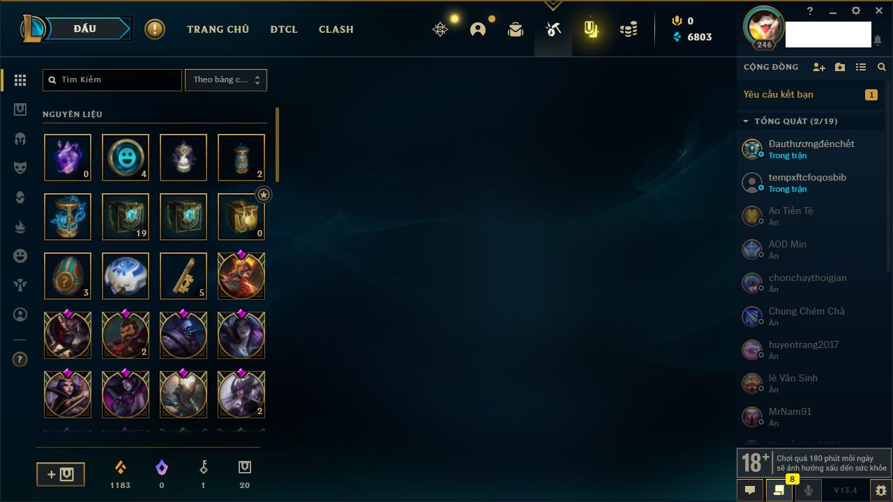 Rank Đơn: Vàng IVKhung: BạcTướng: 171 - Còn 426239 THXTrang Phục: 162Rank ĐTCL: Chưa RankLinh Thú: 33