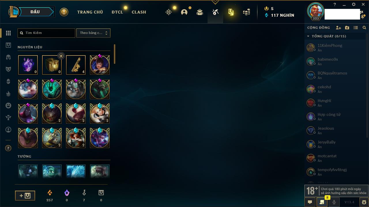 Rank Đơn: Vàng IVKhung: BạcTướng: 171 - Còn 426239 THXTrang Phục: 162Rank ĐTCL: Chưa RankLinh Thú: 33