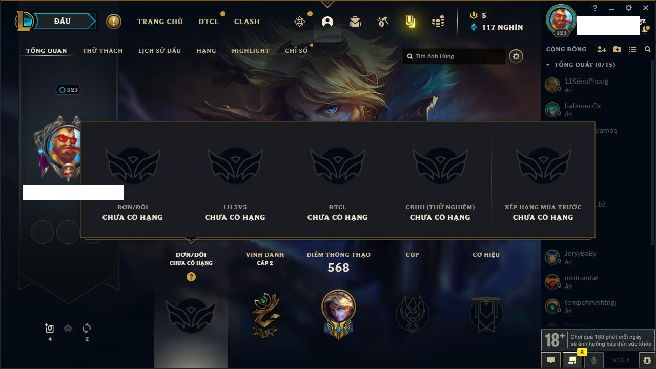 Rank Đơn: Bạc IIKhung: VàngTướng: 171 - Còn 332462 THXTrang Phục: 165Rank ĐTCL: Kim Cương IVLinh Thú: 181