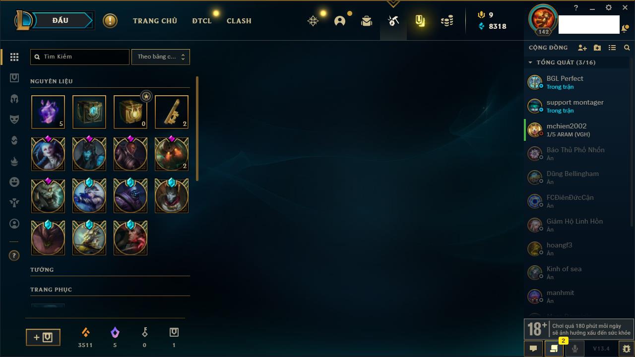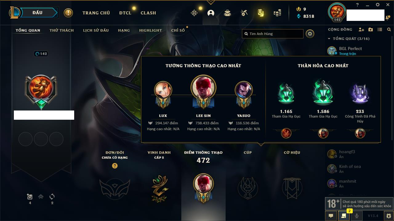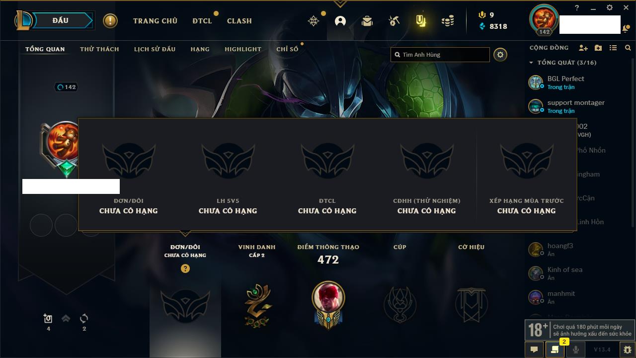 Rank Đơn: Chưa rank mùa nàoKhung: Chưa có khungTướng: 3 - Còn 34550 THXTrang Phục: 0Rank ĐTCL: Bạch Kim IVLinh Thú: 41