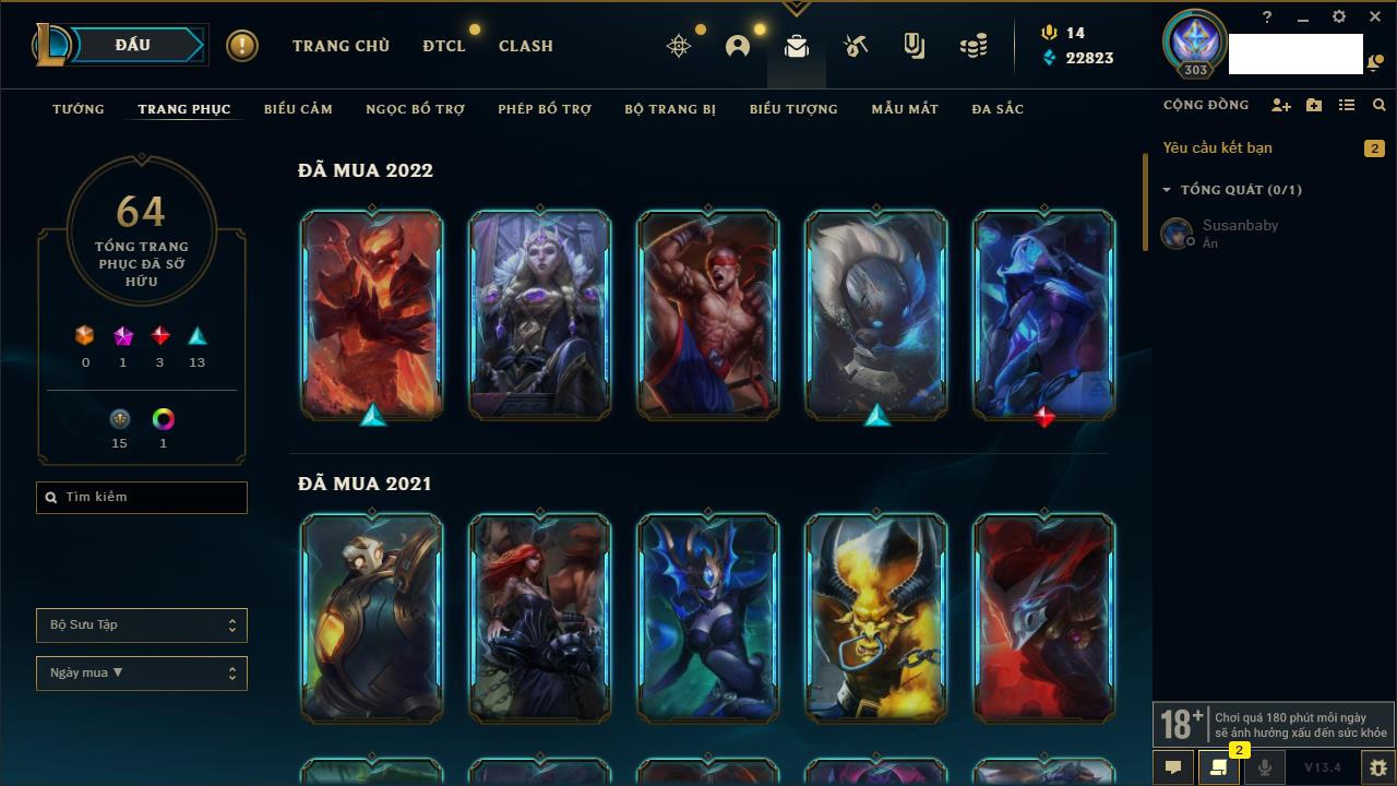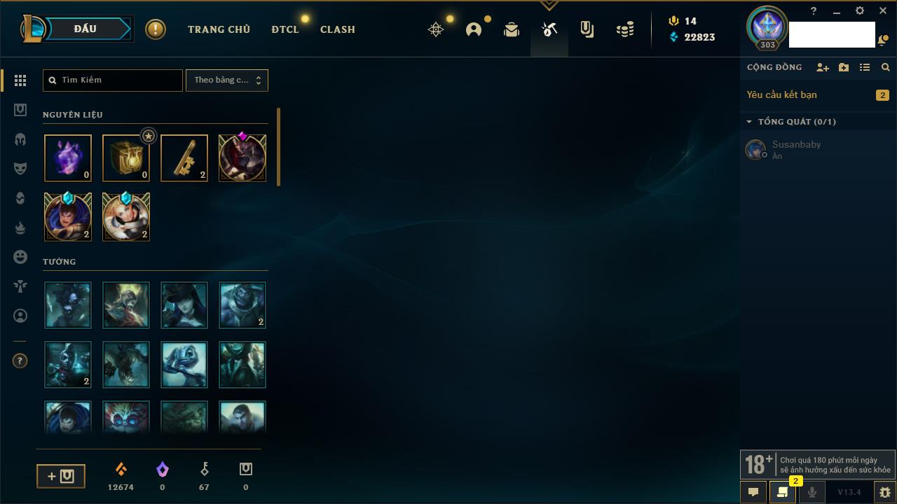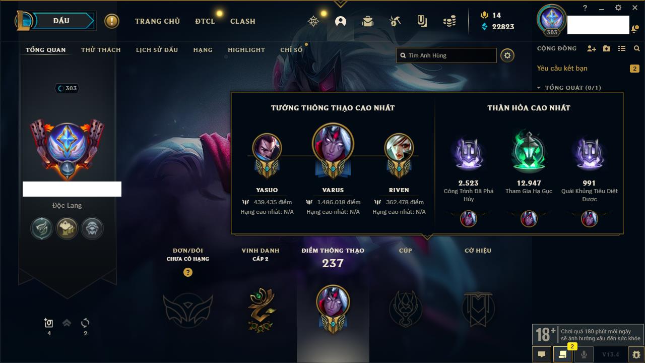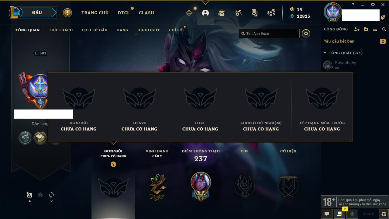 Rank Đơn: Vàng IIIKhung: BạcTướng: 171 - Còn 101359 THXTrang Phục: 88Rank ĐTCL: Kim Cương IVLinh Thú: 200
