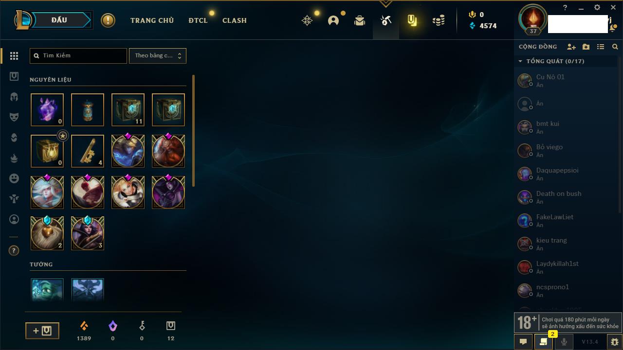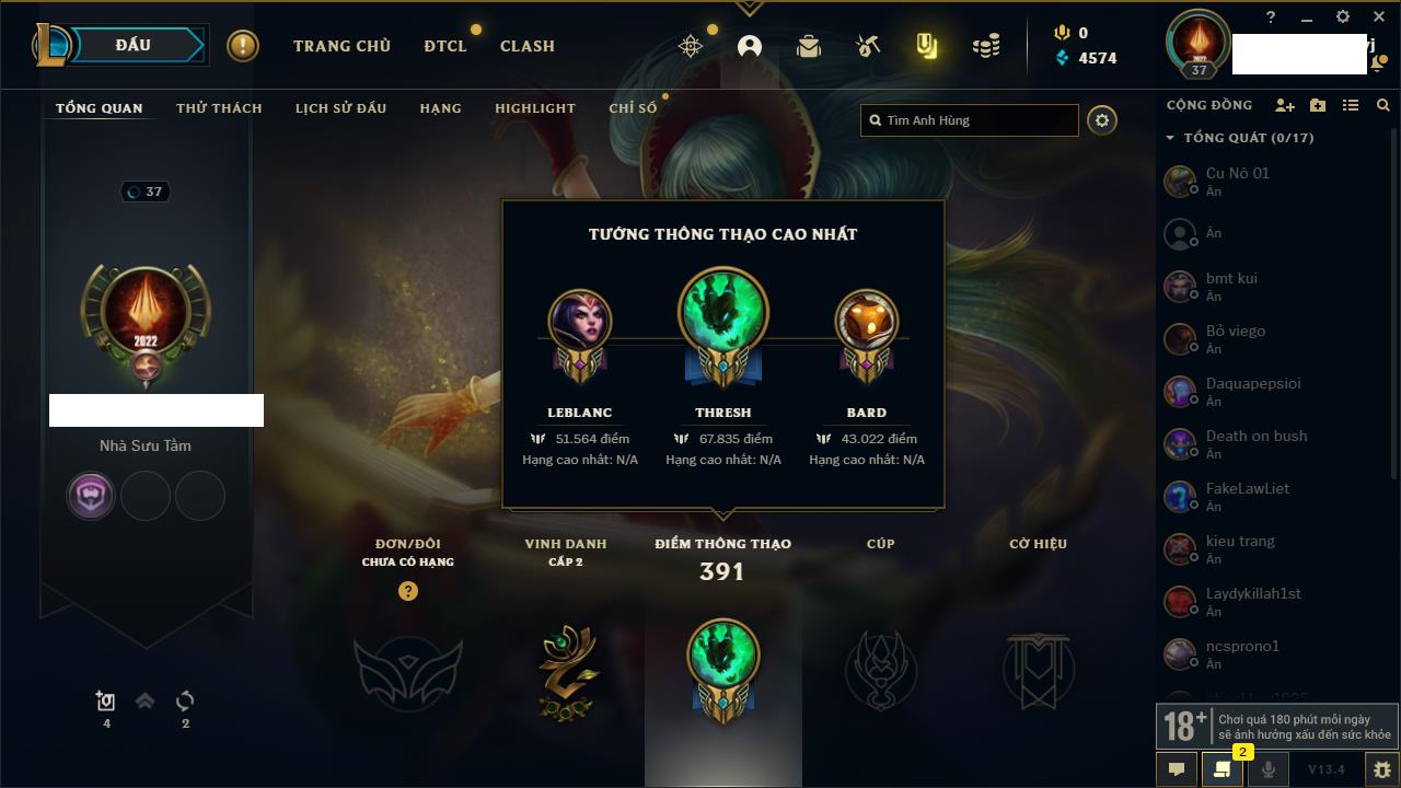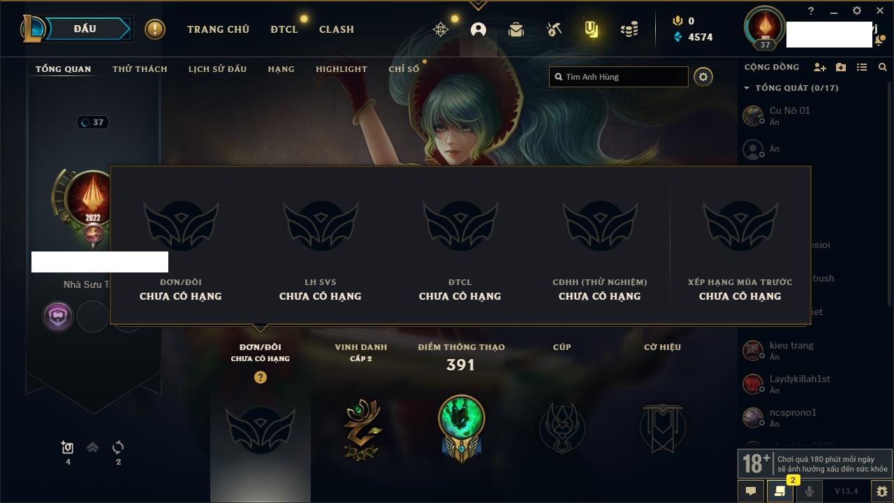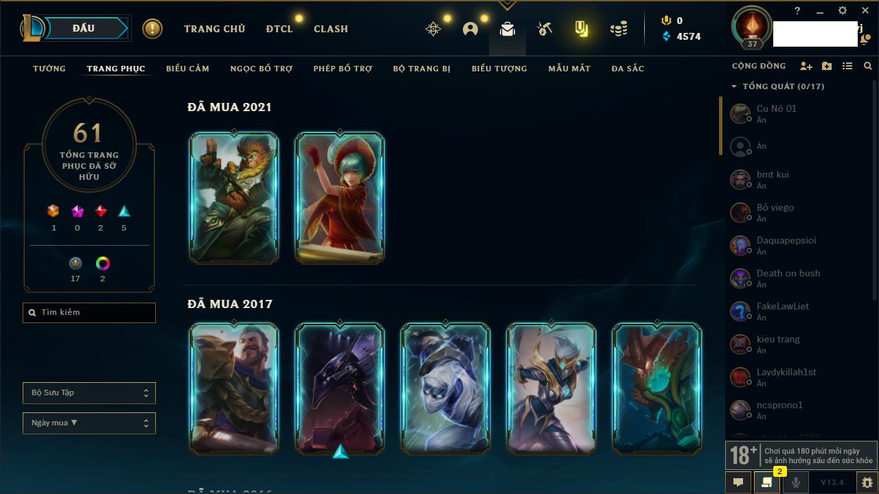 Rank Đơn: Bạch Kim IIKhung: Bạch kimTướng: 171 - Còn 316137 THXTrang Phục: 89Rank ĐTCL: Bạch Kim IIILinh Thú: 94