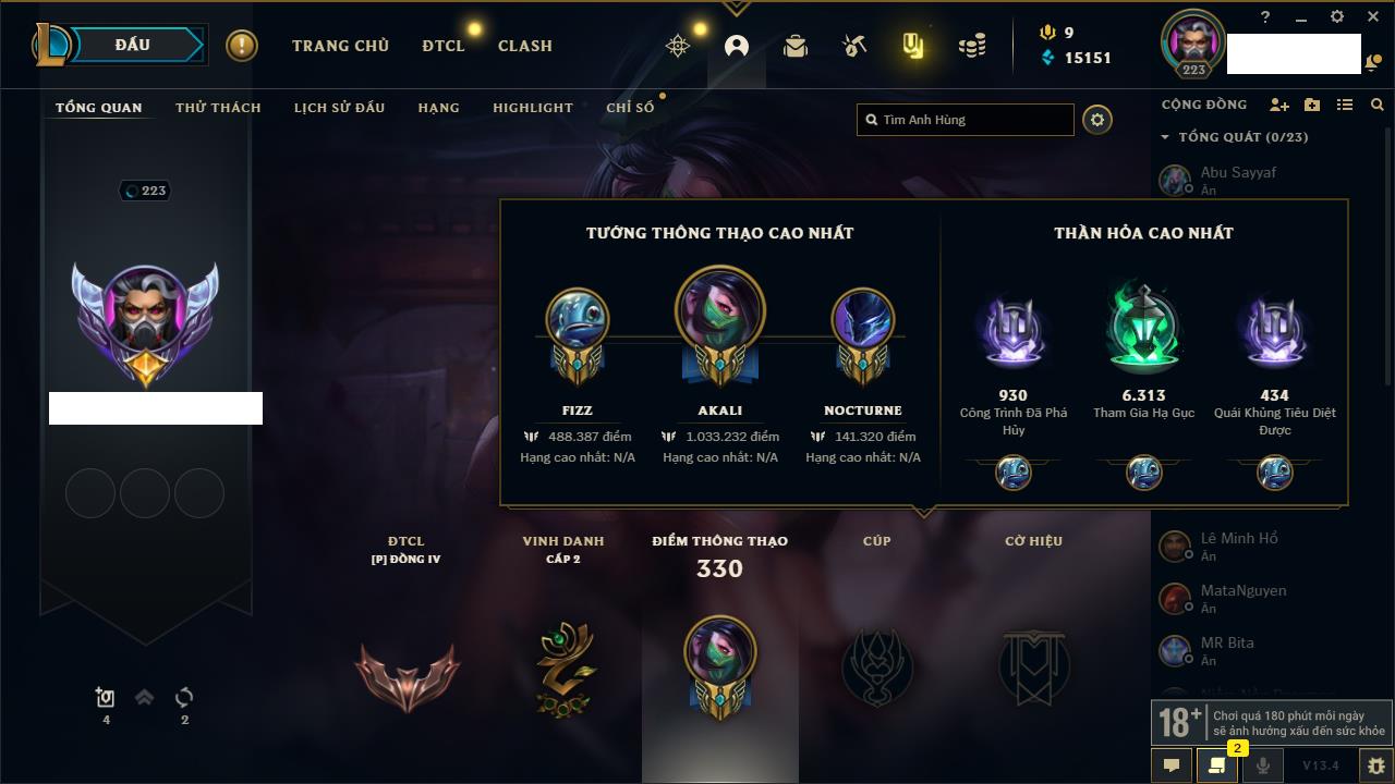 Rank Đơn: Đồng IKhung: ĐồngTướng: 168 - Còn 11447 THXTrang Phục: 245Rank ĐTCL: Chưa RankLinh Thú: 53