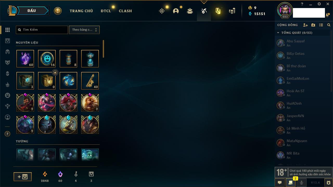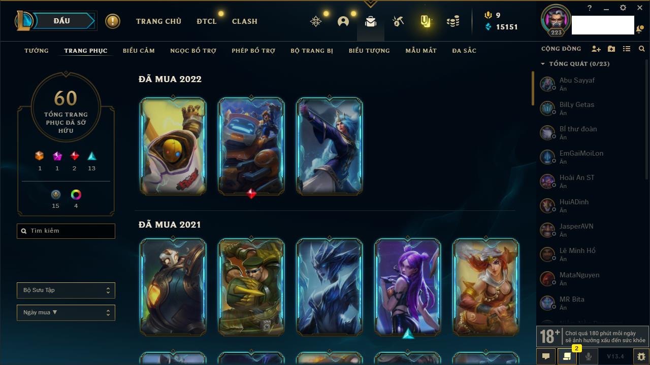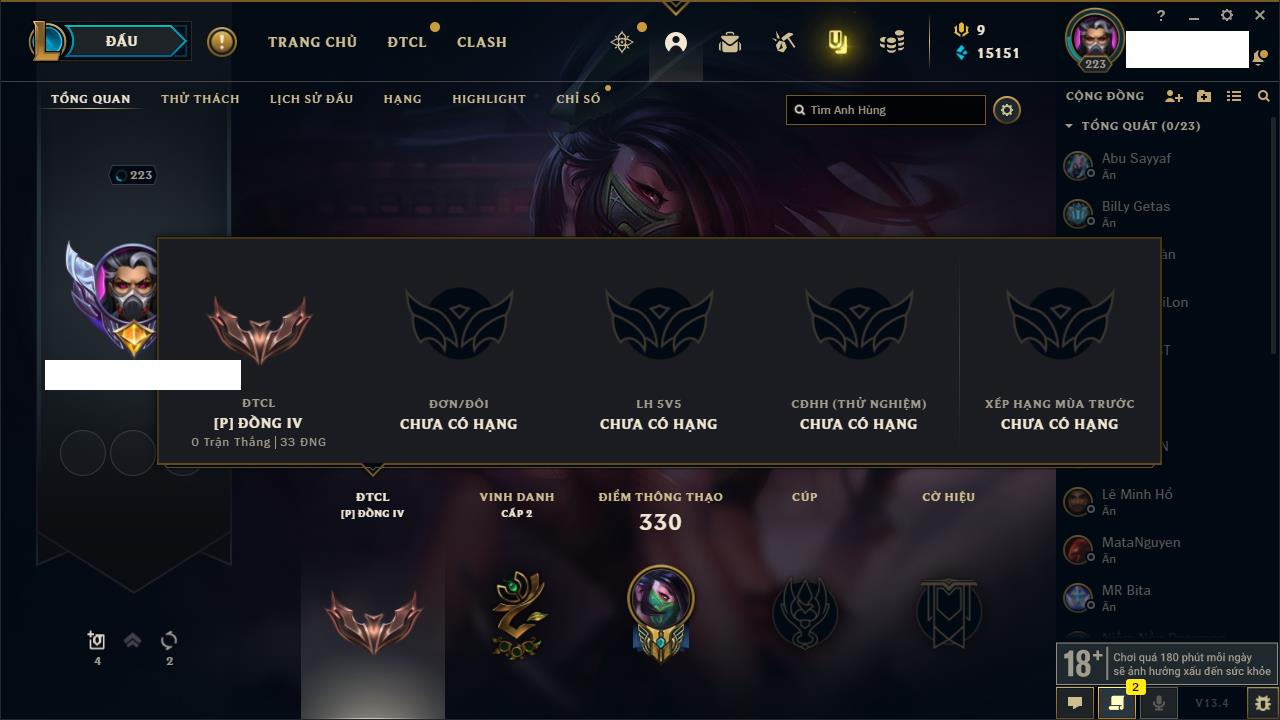 Rank Đơn: Vàng IIIKhung: BạcTướng: 171 - Còn 101359 THXTrang Phục: 88Rank ĐTCL: Kim Cương IVLinh Thú: 200