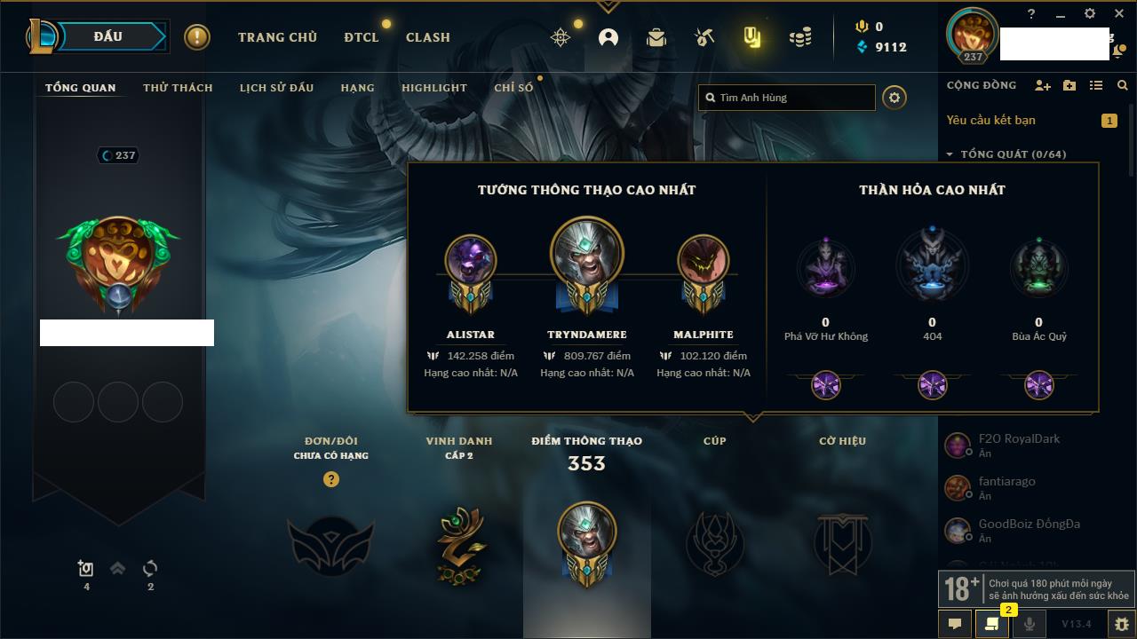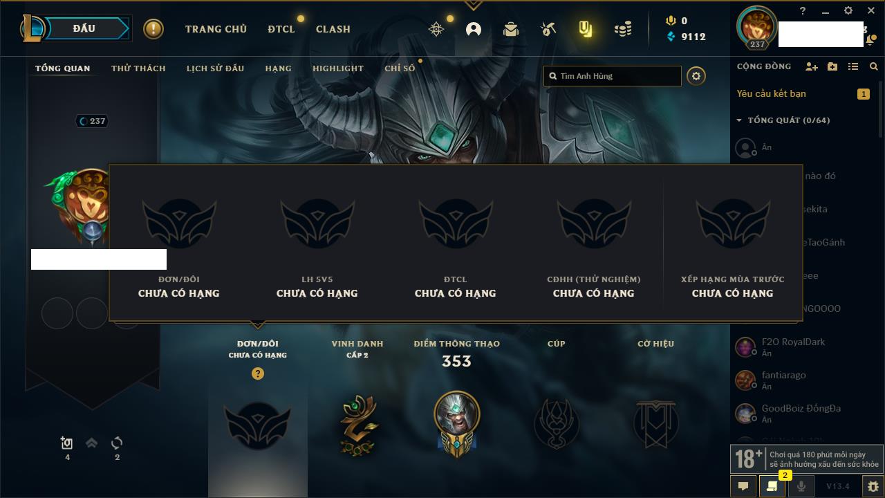 Rank Đơn: Chưa RankKhung: BạcTướng: 141 - Còn 299 THXTrang Phục: 101Rank ĐTCL: Chưa RankLinh Thú: 84