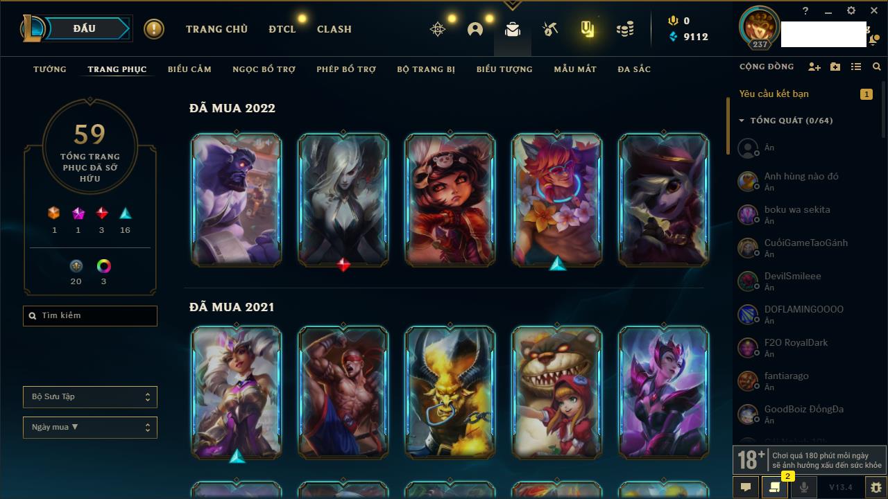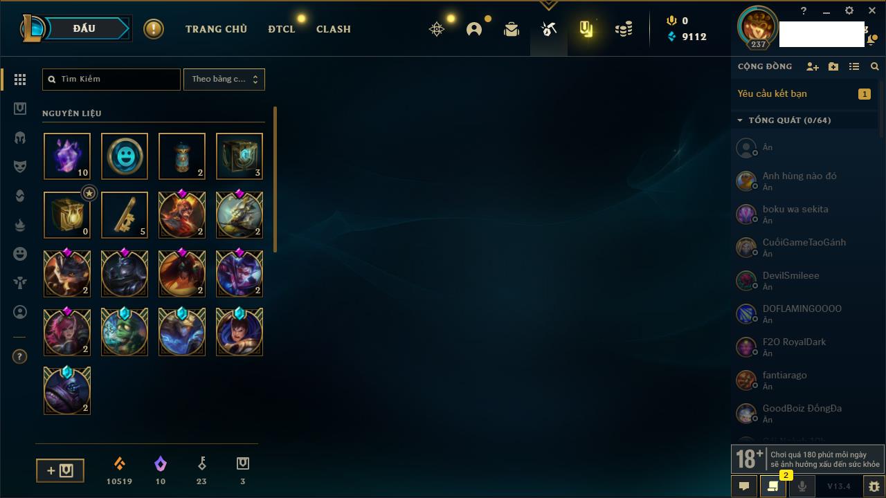 Rank Đơn: Chưa RankKhung: Chưa có khungTướng: 162 - Còn 23234 THXTrang Phục: 150Rank ĐTCL: Chưa RankLinh Thú: 42