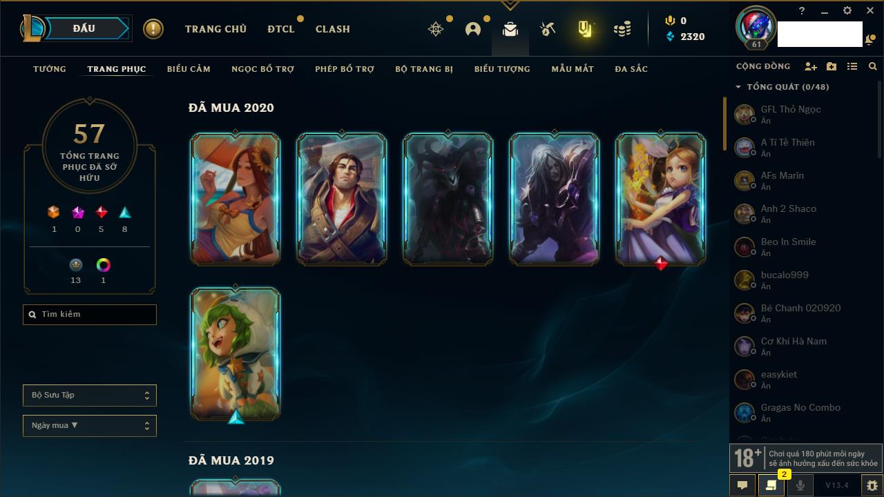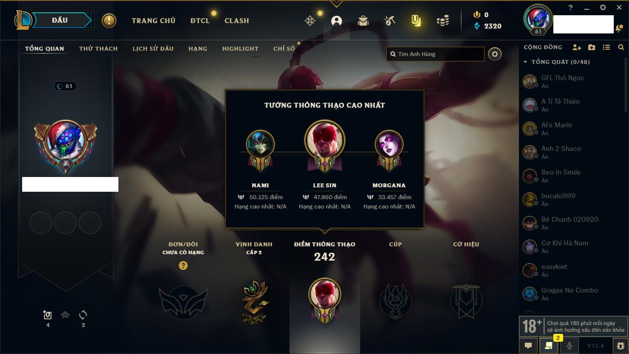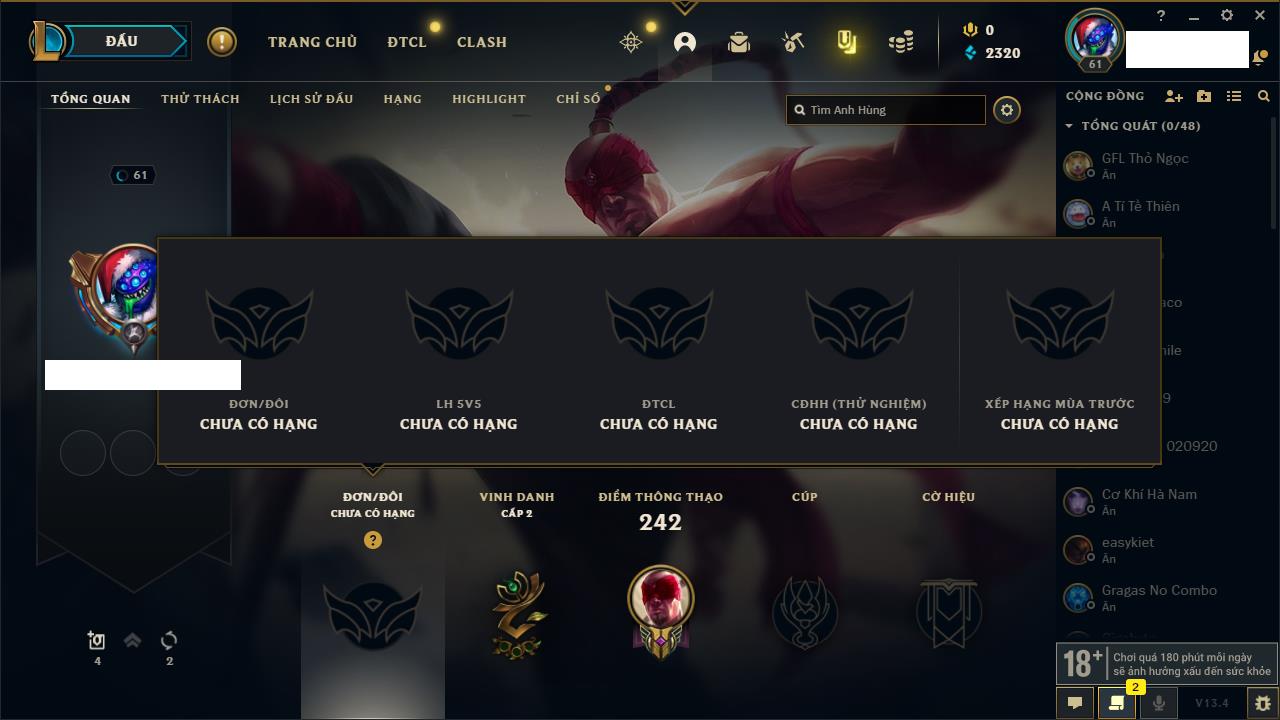 Rank Đơn: Chưa RankKhung: Chưa có khungTướng: 170 - Còn 72514 THXTrang Phục: 202Rank ĐTCL: Chưa RankLinh Thú: 191