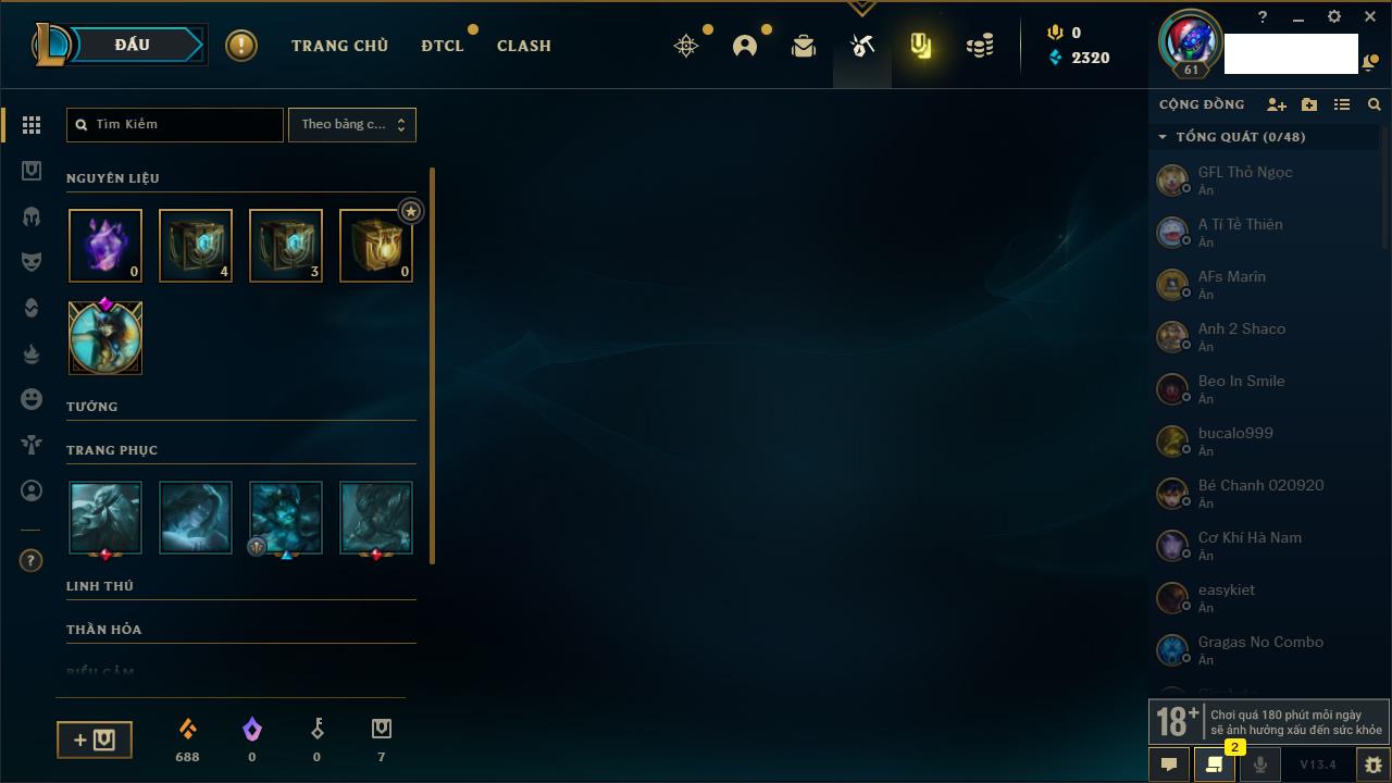 Rank Đơn: Chưa rank mùa nàoKhung: Chưa có khungTướng: 1 - Còn 3000 THXTrang Phục: 0Rank ĐTCL: Vàng ILinh Thú: 6