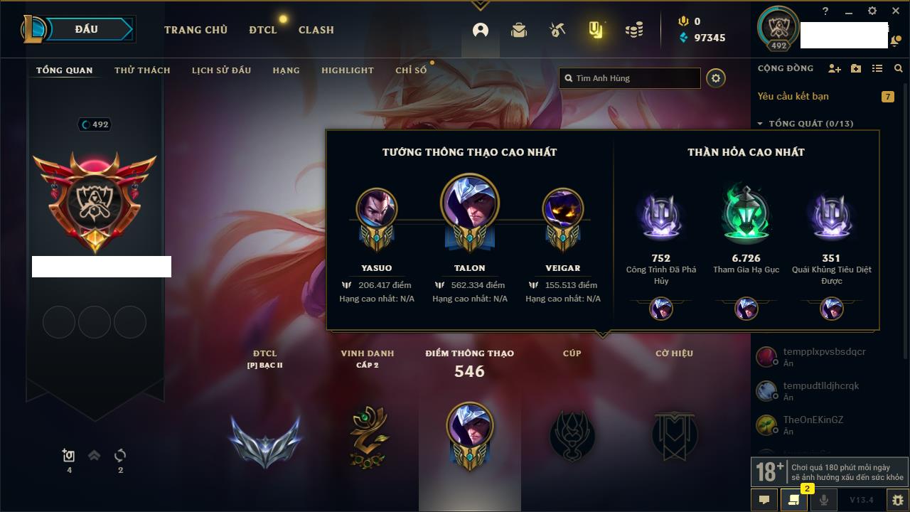 Rank Đơn: Bạc IKhung: Bạch kimTướng: 86 - Còn 1608 THXTrang Phục: 47Rank ĐTCL: Chưa RankLinh Thú: 58