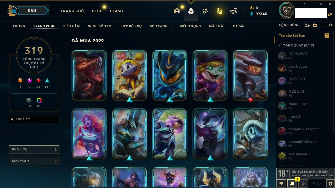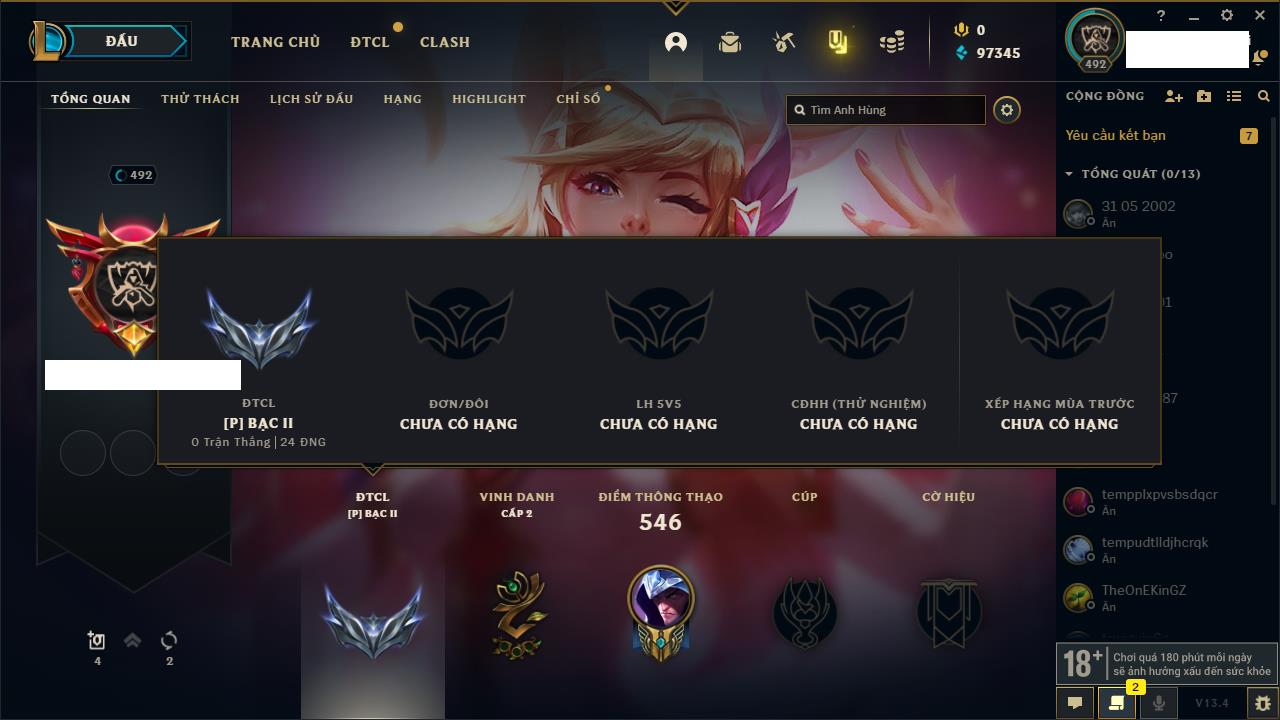 Rank Đơn: Bạc IIIKhung: BạcTướng: 170 - Còn 76760 THXTrang Phục: 235Rank ĐTCL: Chưa RankLinh Thú: 183