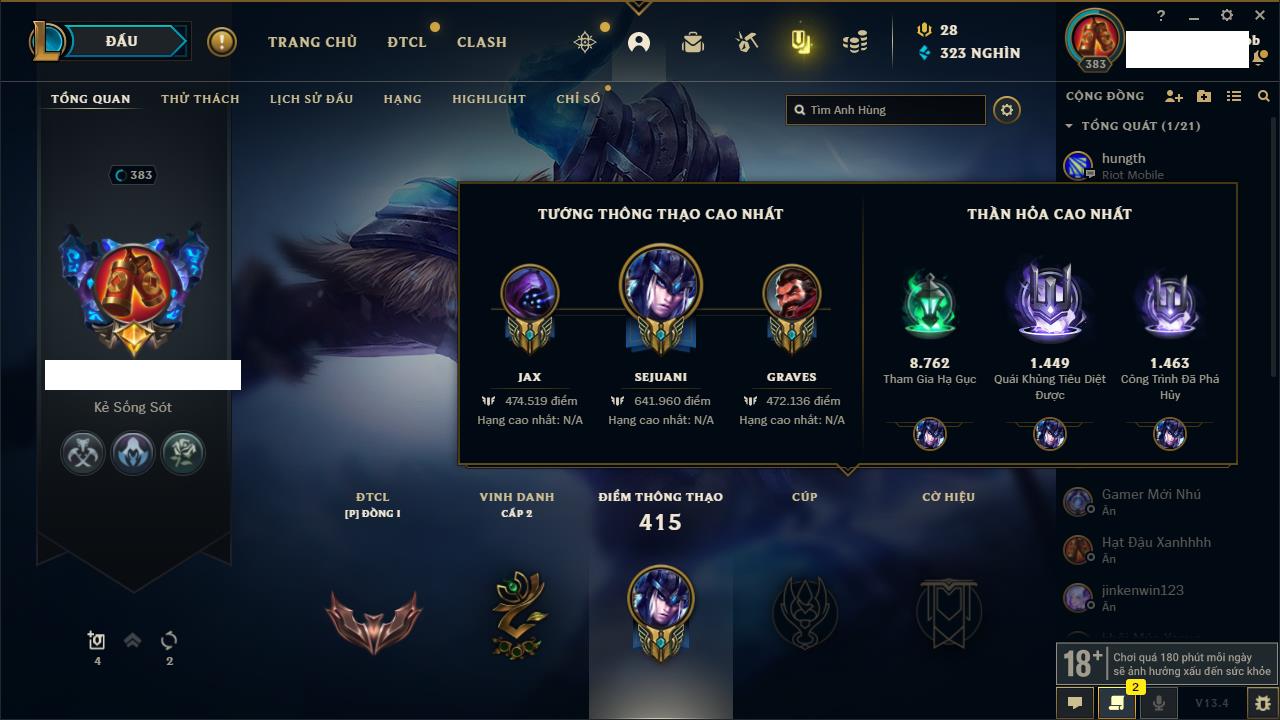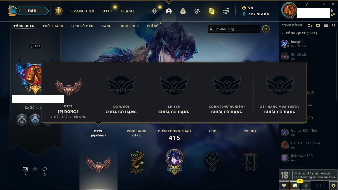 Rank Đơn: Chưa RankKhung: BạcTướng: 141 - Còn 299 THXTrang Phục: 101Rank ĐTCL: Chưa RankLinh Thú: 84