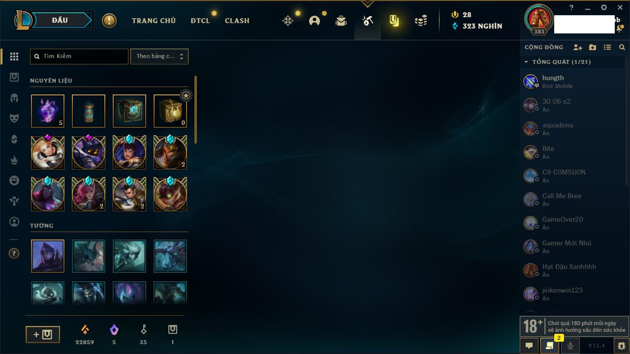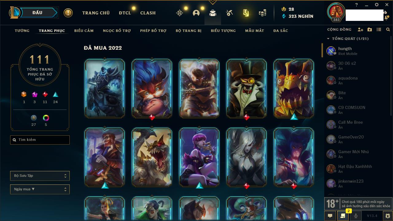Rank Đơn: Chưa RankKhung: Chưa có khungTướng: 162 - Còn 23234 THXTrang Phục: 150Rank ĐTCL: Chưa RankLinh Thú: 42
