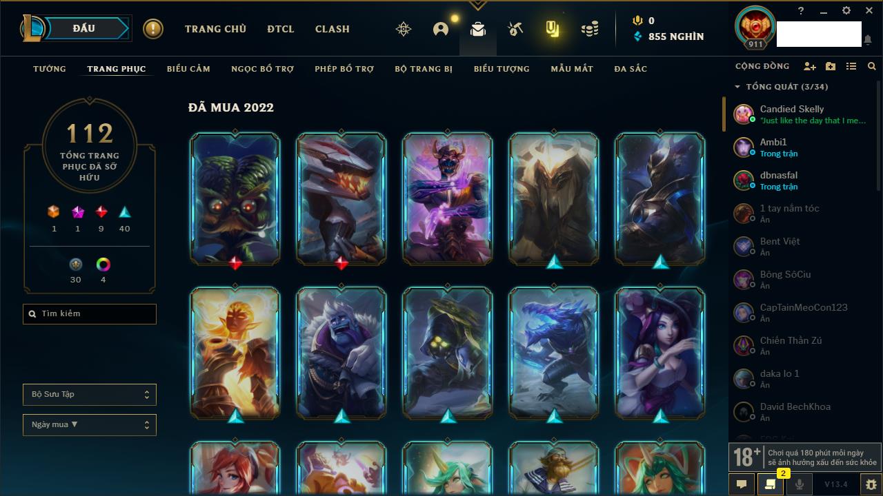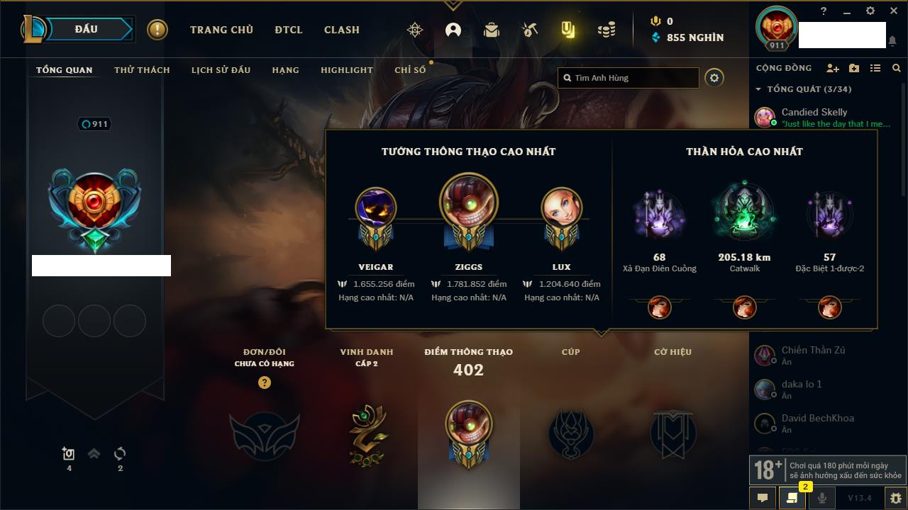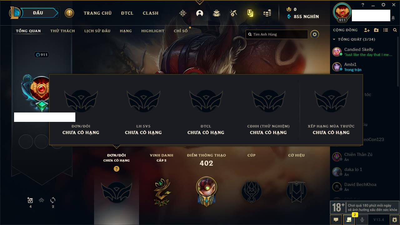 Rank Đơn: Đồng IIIKhung: ĐồngTướng: 170 - Còn 48082 THXTrang Phục: 272Rank ĐTCL: Chưa RankLinh Thú: 84