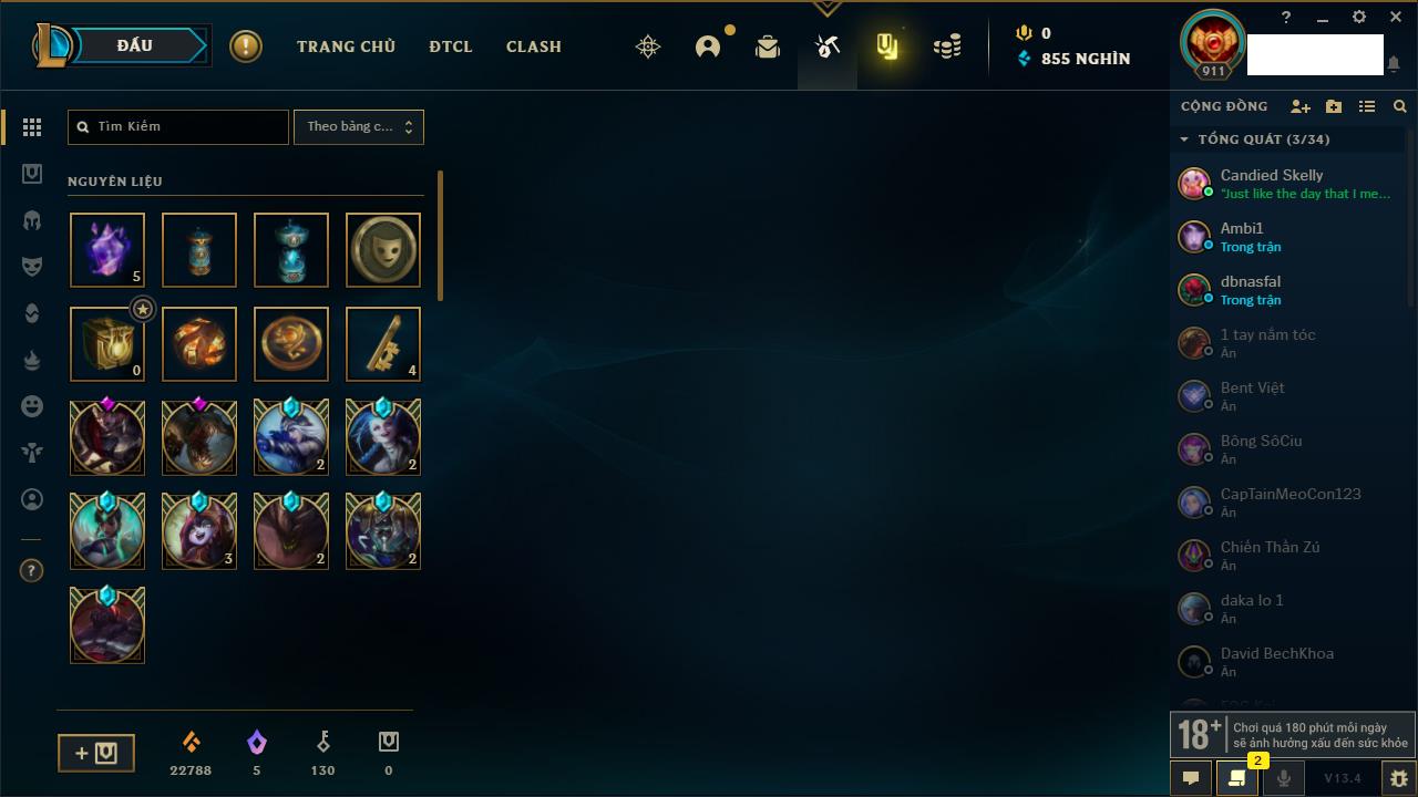 Rank Đơn: Bạch Kim IVKhung: Bạch kimTướng: 171 - Còn 182788 THXTrang Phục: 158Rank ĐTCL: Lục Bảo IVLinh Thú: 56