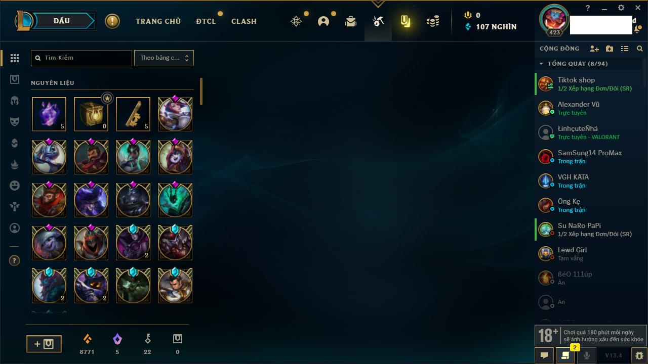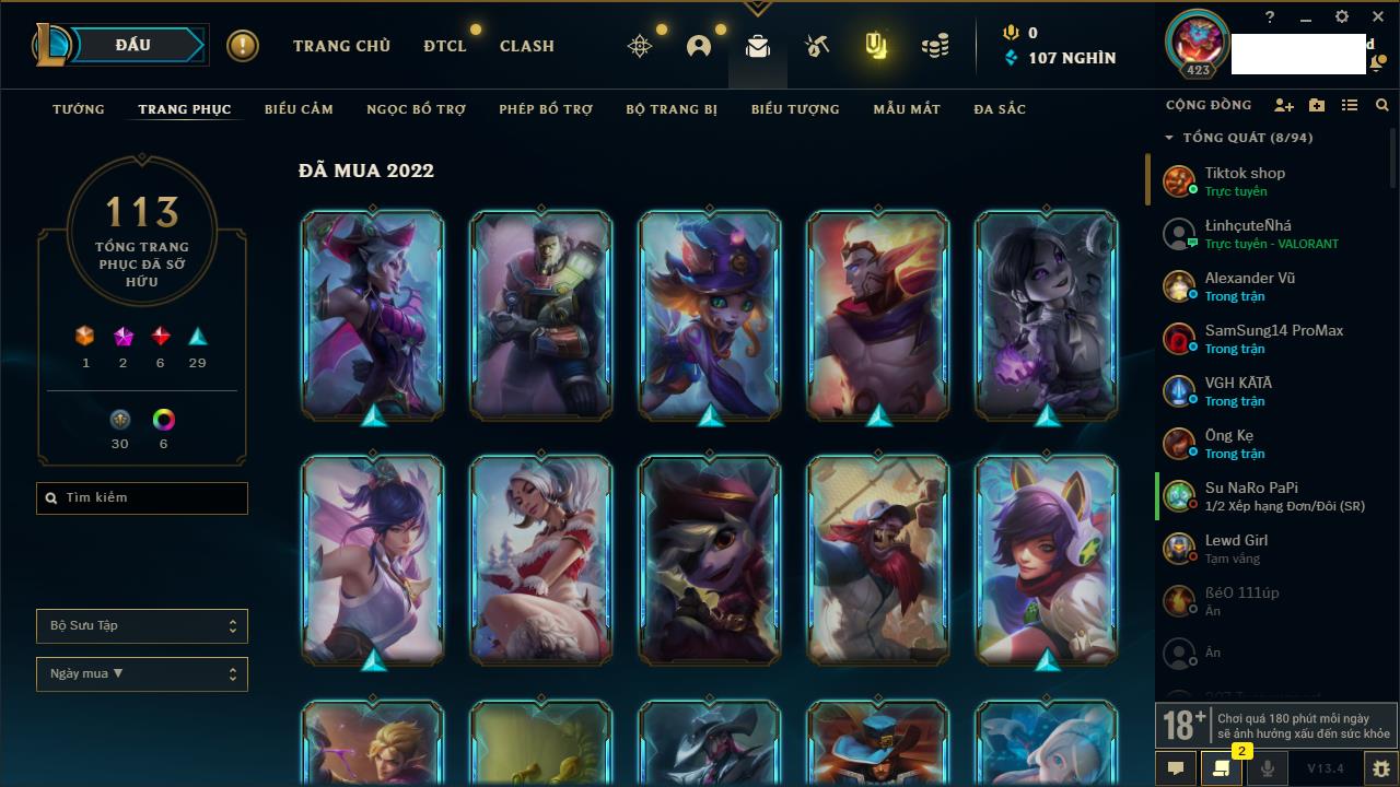 Rank Đơn: Chưa RankKhung: Chưa có khungTướng: 97 - Còn 1784 THXTrang Phục: 77Rank ĐTCL: Chưa RankLinh Thú: 72
