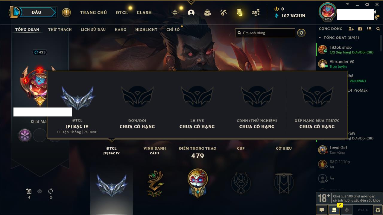 Rank Đơn: Chưa RankKhung: Chưa có khungTướng: 154 - Còn 18477 THXTrang Phục: 127Rank ĐTCL: Vàng ILinh Thú: 183