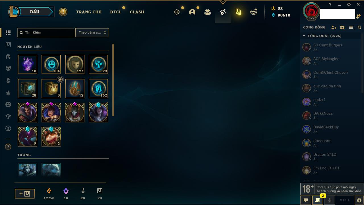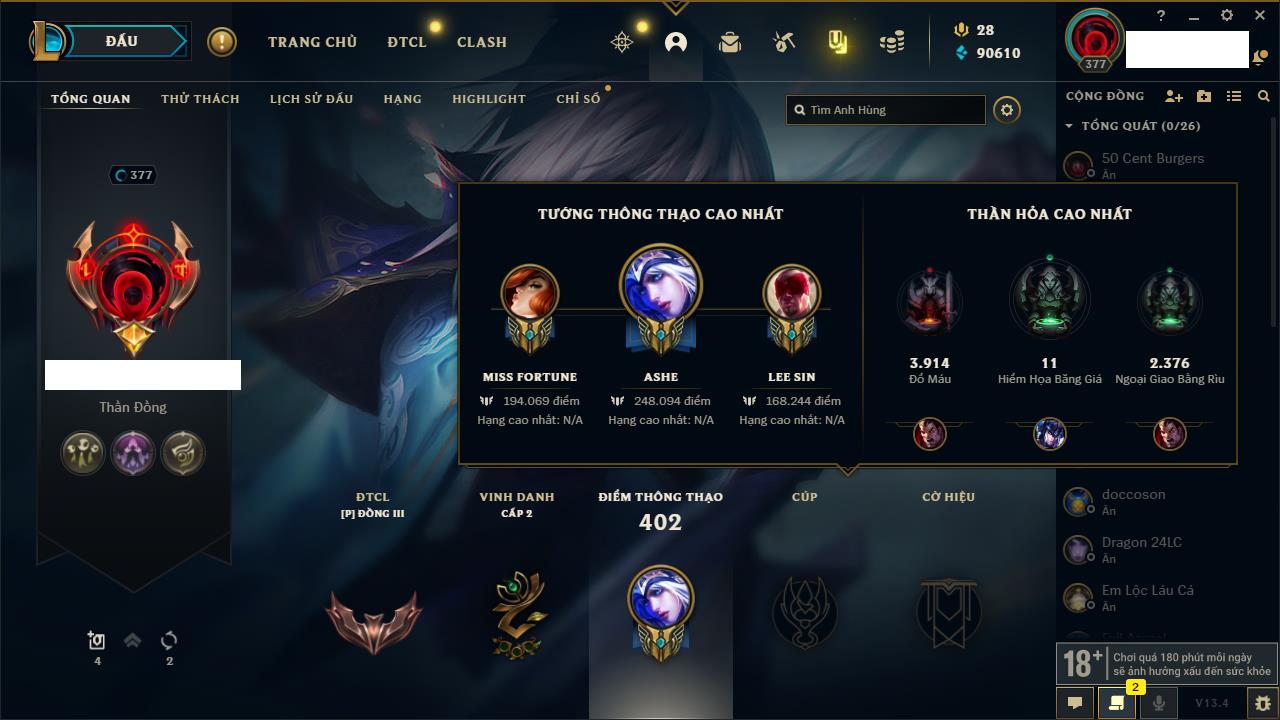 Rank Đơn: Đồng IIKhung: Chưa có khungTướng: 170 - Còn 56487 THXTrang Phục: 90Rank ĐTCL: Chưa RankLinh Thú: 129