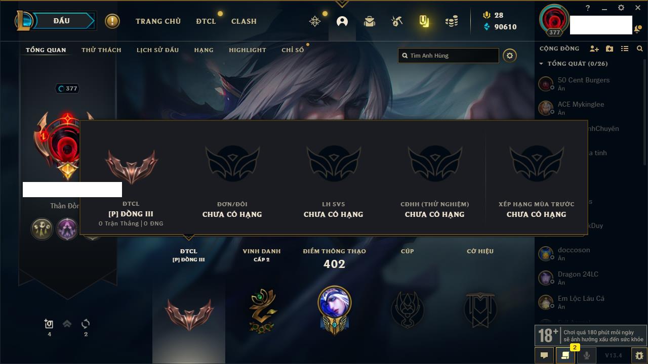Rank Đơn: Đồng IIIKhung: ĐồngTướng: 171 - Còn 54778 THXTrang Phục: 96Rank ĐTCL: Bạch Kim IIILinh Thú: 140
