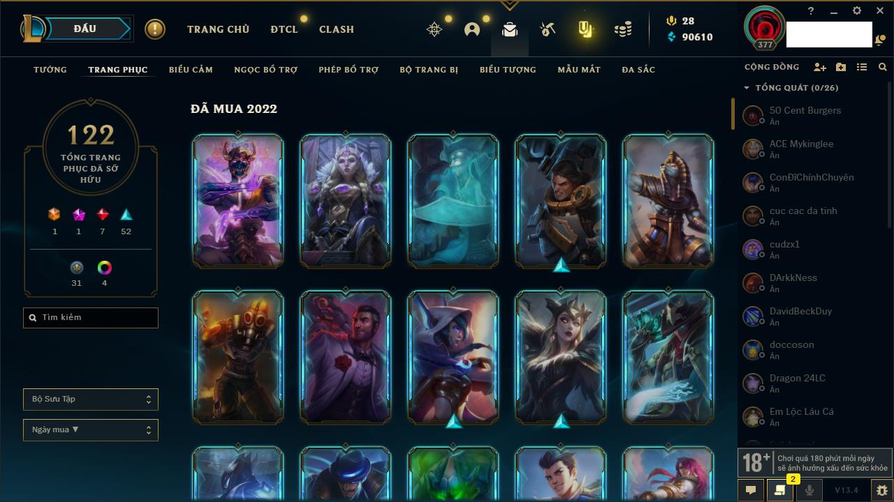 Rank Đơn: Vàng IIIKhung: VàngTướng: 170 - Còn 33222 THXTrang Phục: 136Rank ĐTCL: Chưa RankLinh Thú: 40