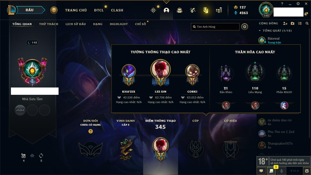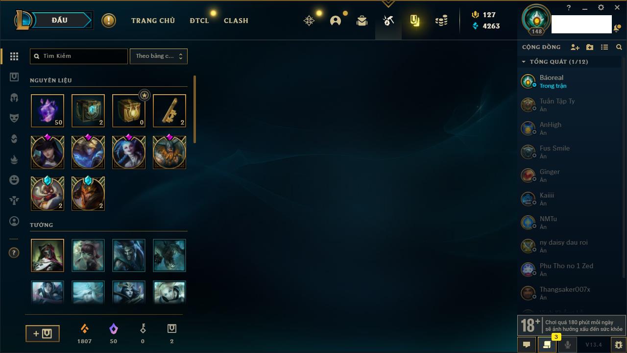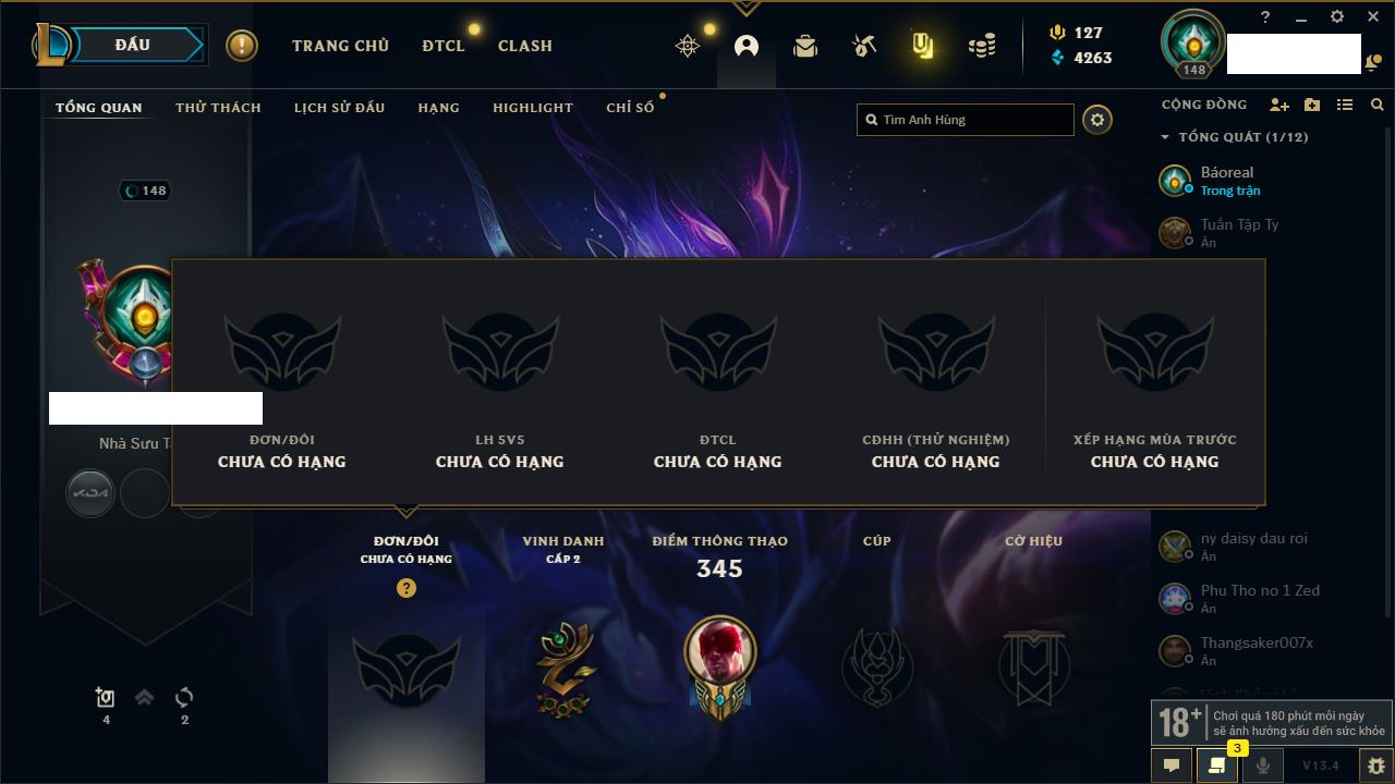 Rank Đơn: Đồng IIKhung: Chưa có khungTướng: 170 - Còn 56487 THXTrang Phục: 90Rank ĐTCL: Chưa RankLinh Thú: 129