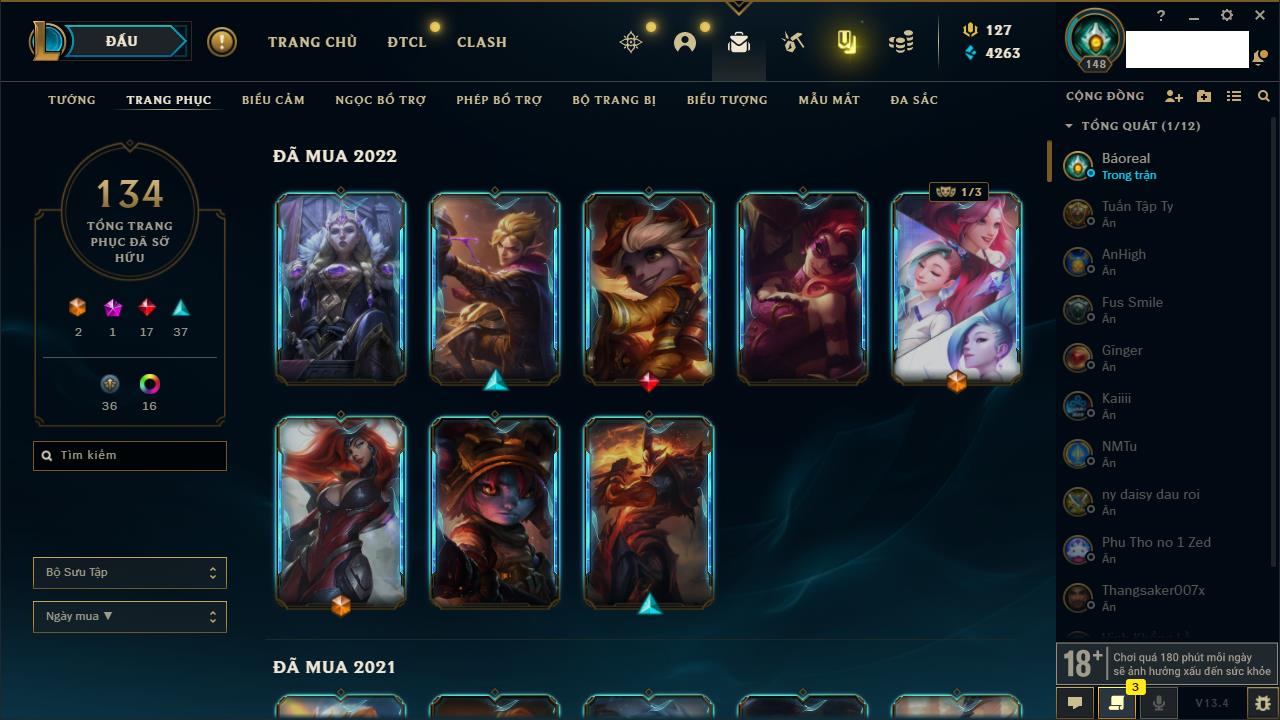 Rank Đơn: Vàng IIIKhung: VàngTướng: 170 - Còn 33222 THXTrang Phục: 136Rank ĐTCL: Chưa RankLinh Thú: 40