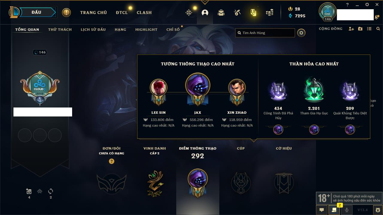 Rank Đơn: Vàng IVKhung: BạcTướng: 166 - Còn 180925 THXTrang Phục: 163Rank ĐTCL: Chưa RankLinh Thú: 67