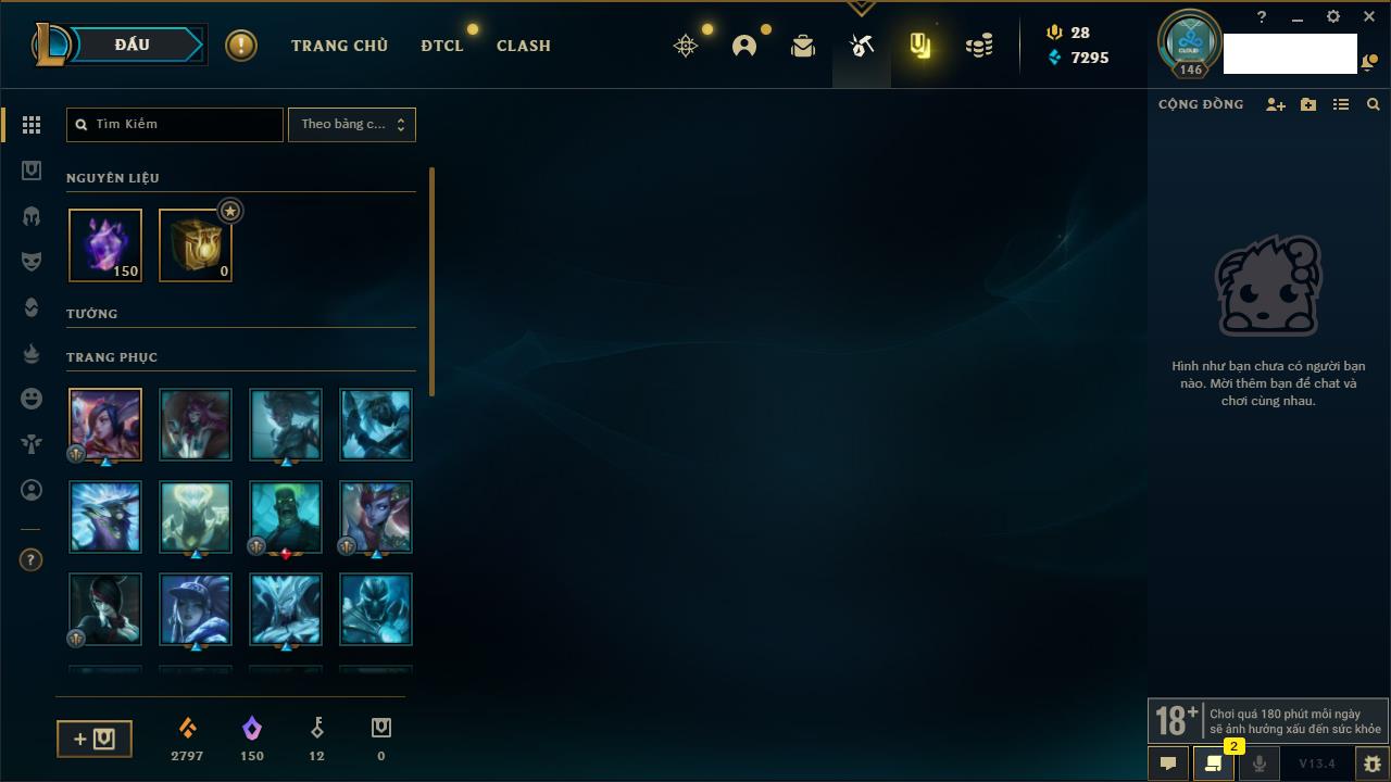 Rank Đơn: Vàng IVKhung: BạcTướng: 171 - Còn 426239 THXTrang Phục: 162Rank ĐTCL: Chưa RankLinh Thú: 33