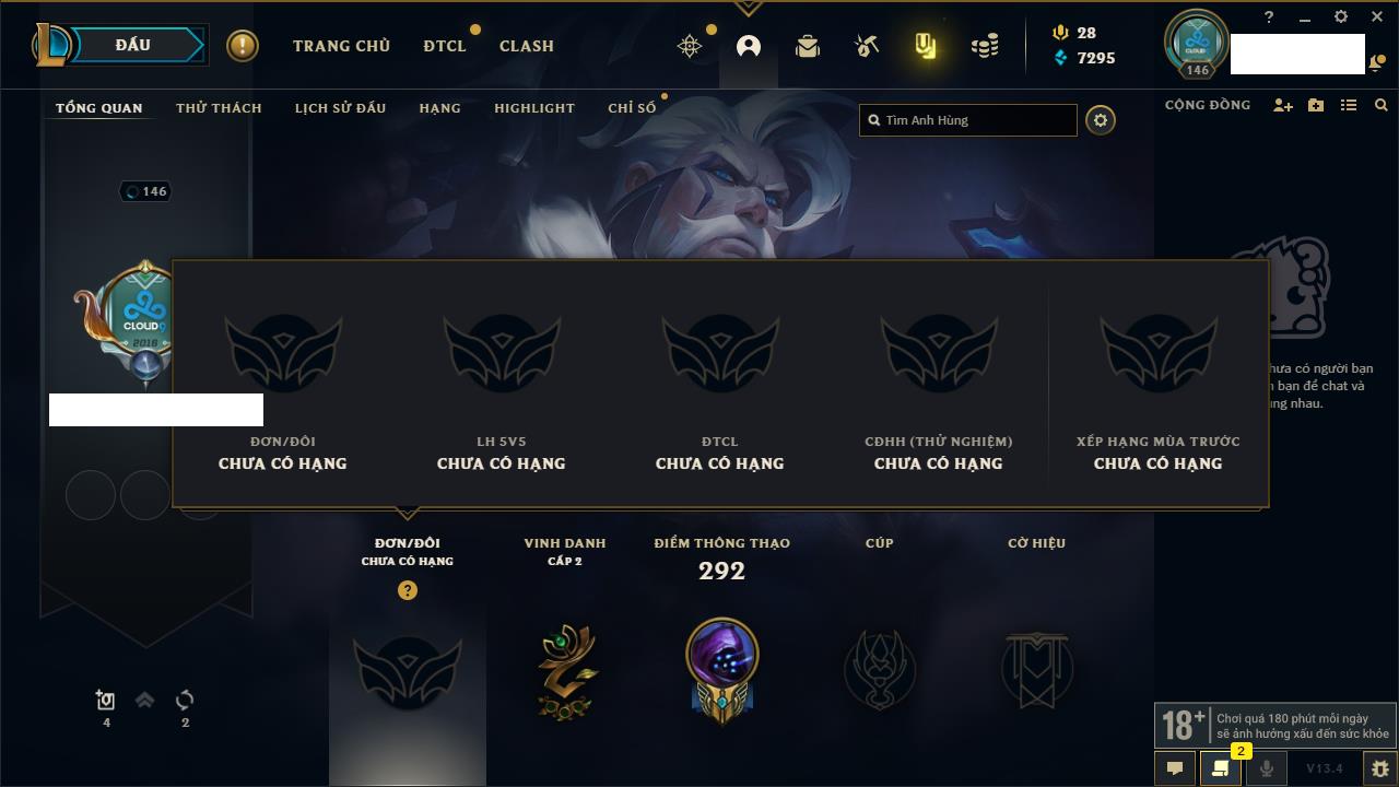Rank Đơn: Bạc IIKhung: VàngTướng: 171 - Còn 332462 THXTrang Phục: 165Rank ĐTCL: Kim Cương IVLinh Thú: 181
