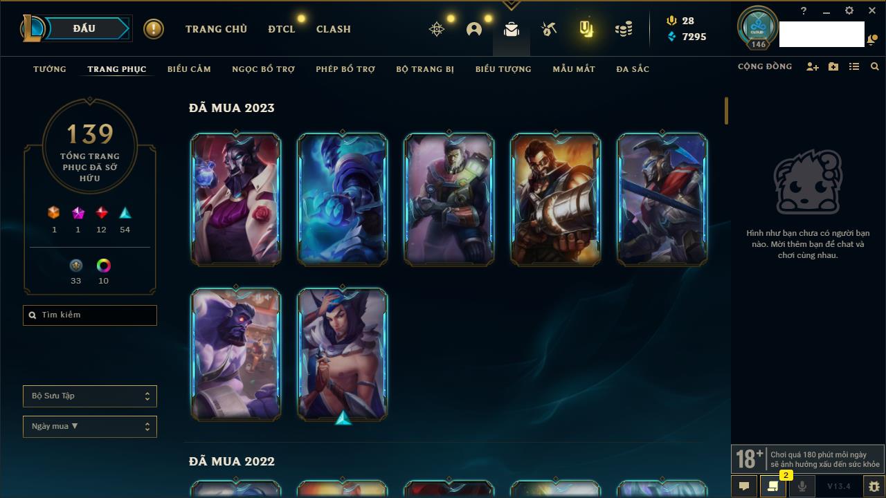 Rank Đơn: Vàng IVKhung: VàngTướng: 171 - Còn 48721 THXTrang Phục: 171Rank ĐTCL: Chưa RankLinh Thú: 27