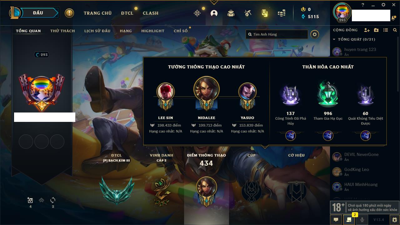 Rank Đơn: Chưa RankKhung: Chưa có khungTướng: 154 - Còn 18477 THXTrang Phục: 127Rank ĐTCL: Vàng ILinh Thú: 183
