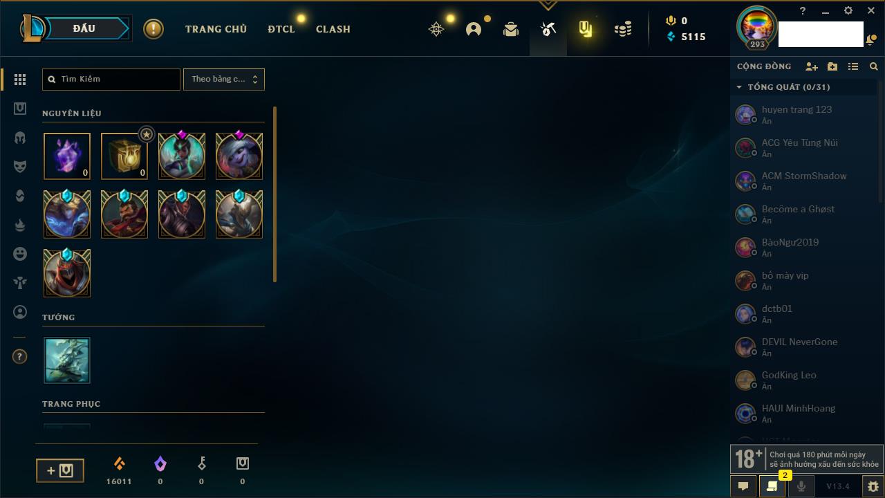 Rank Đơn: Chưa RankKhung: Chưa có khungTướng: 162 - Còn 23234 THXTrang Phục: 150Rank ĐTCL: Chưa RankLinh Thú: 42