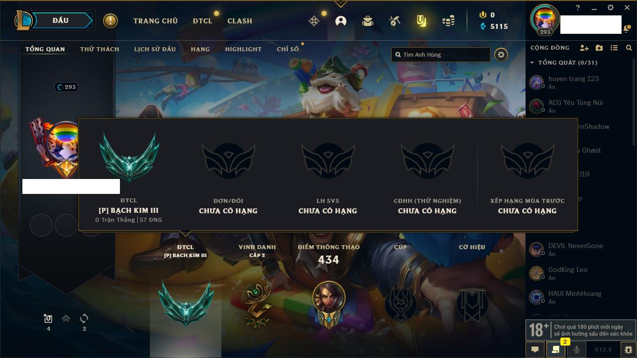 Rank Đơn: Chưa RankKhung: BạcTướng: 141 - Còn 299 THXTrang Phục: 101Rank ĐTCL: Chưa RankLinh Thú: 84