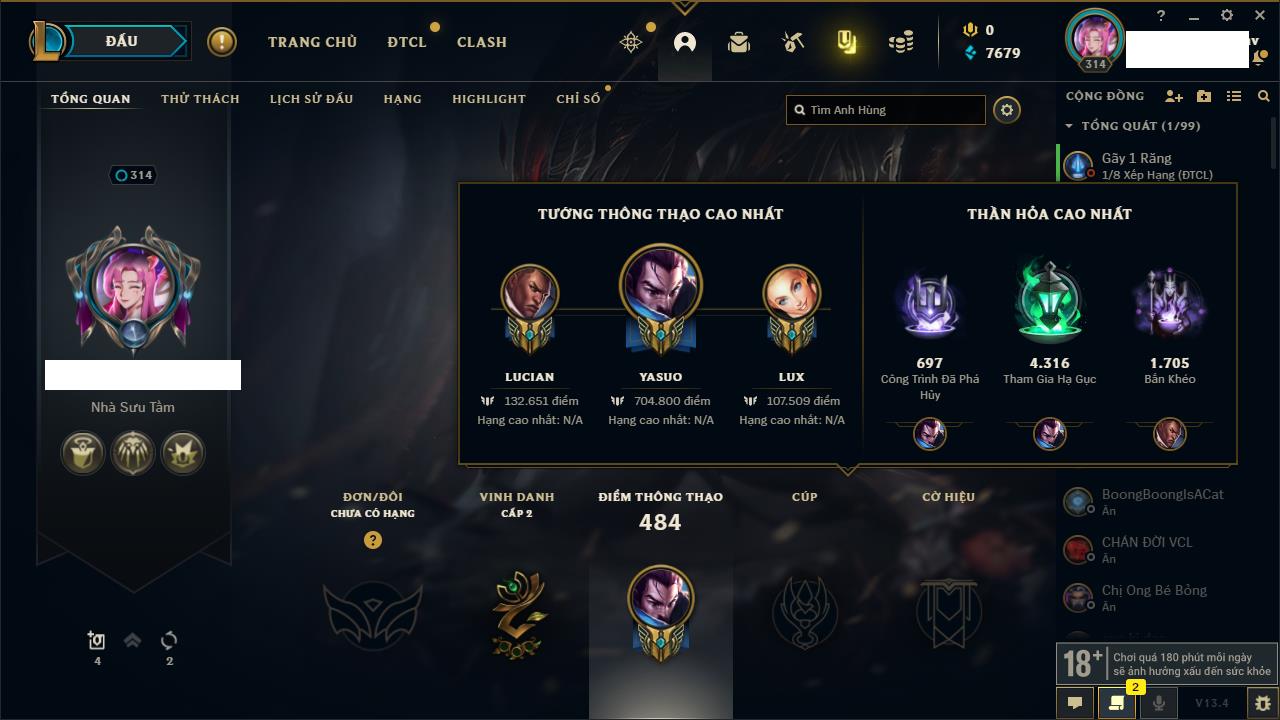 Rank Đơn: Chưa RankKhung: Chưa có khungTướng: 163 - Còn 157403 THXTrang Phục: 149Rank ĐTCL: Chưa RankLinh Thú: 122