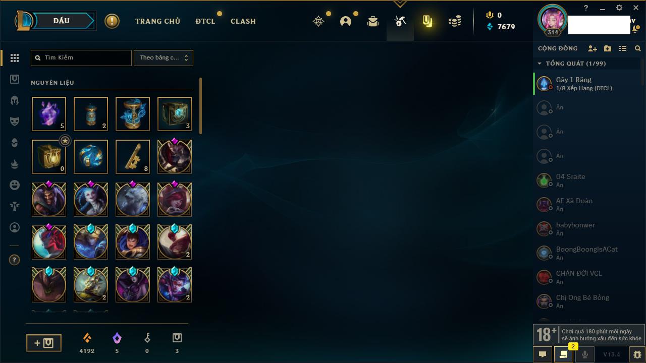 Rank Đơn: Chưa RankKhung: Chưa có khungTướng: 162 - Còn 23234 THXTrang Phục: 150Rank ĐTCL: Chưa RankLinh Thú: 42