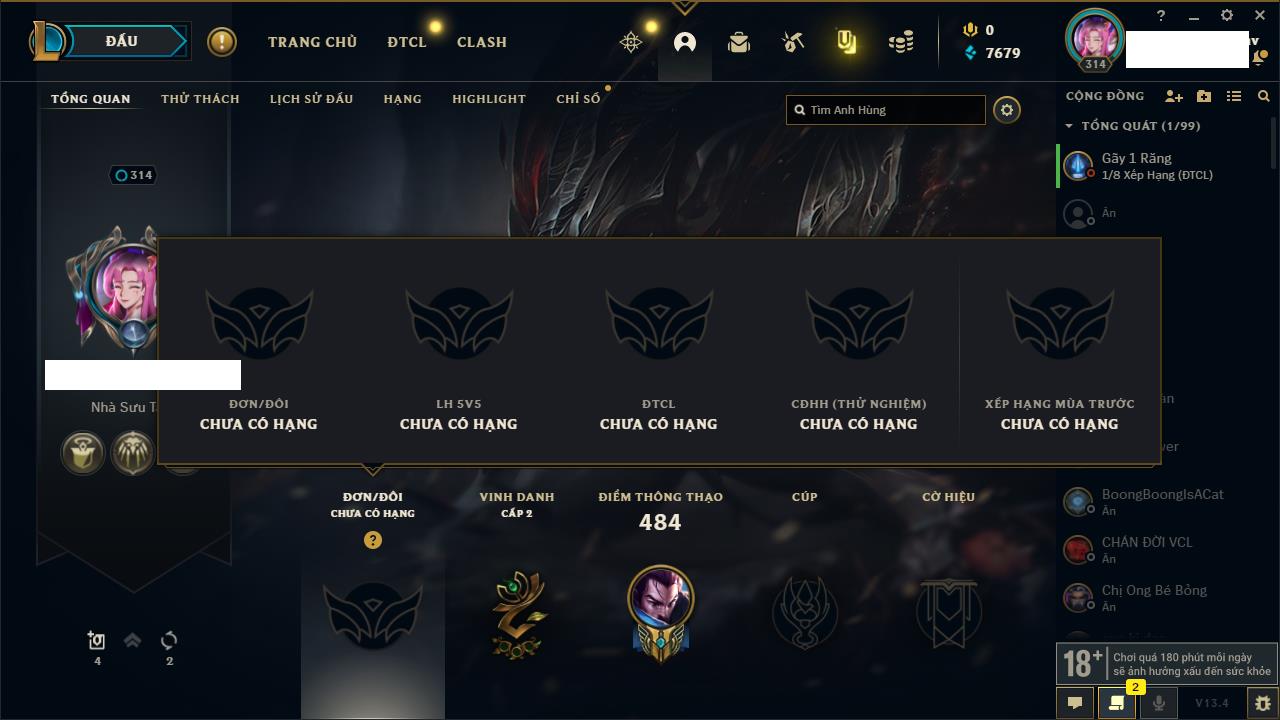 Rank Đơn: Chưa RankKhung: BạcTướng: 141 - Còn 299 THXTrang Phục: 101Rank ĐTCL: Chưa RankLinh Thú: 84