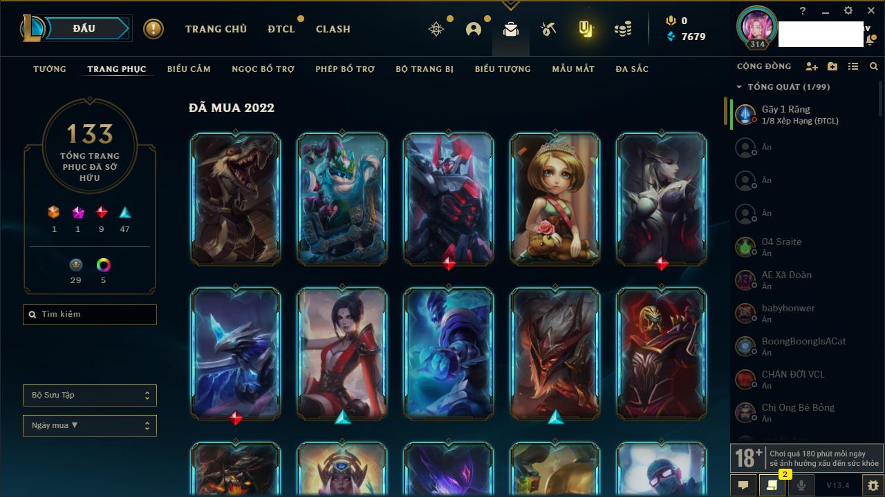 Rank Đơn: Chưa RankKhung: Chưa có khungTướng: 154 - Còn 18477 THXTrang Phục: 127Rank ĐTCL: Vàng ILinh Thú: 183