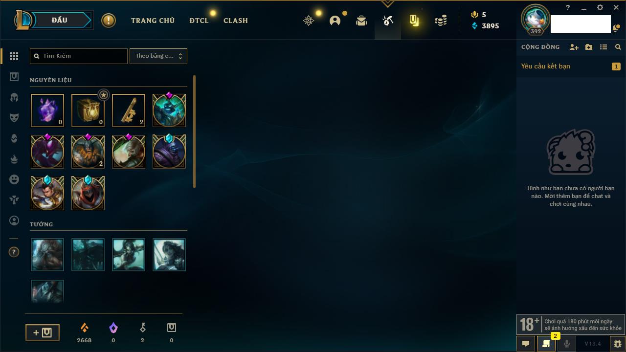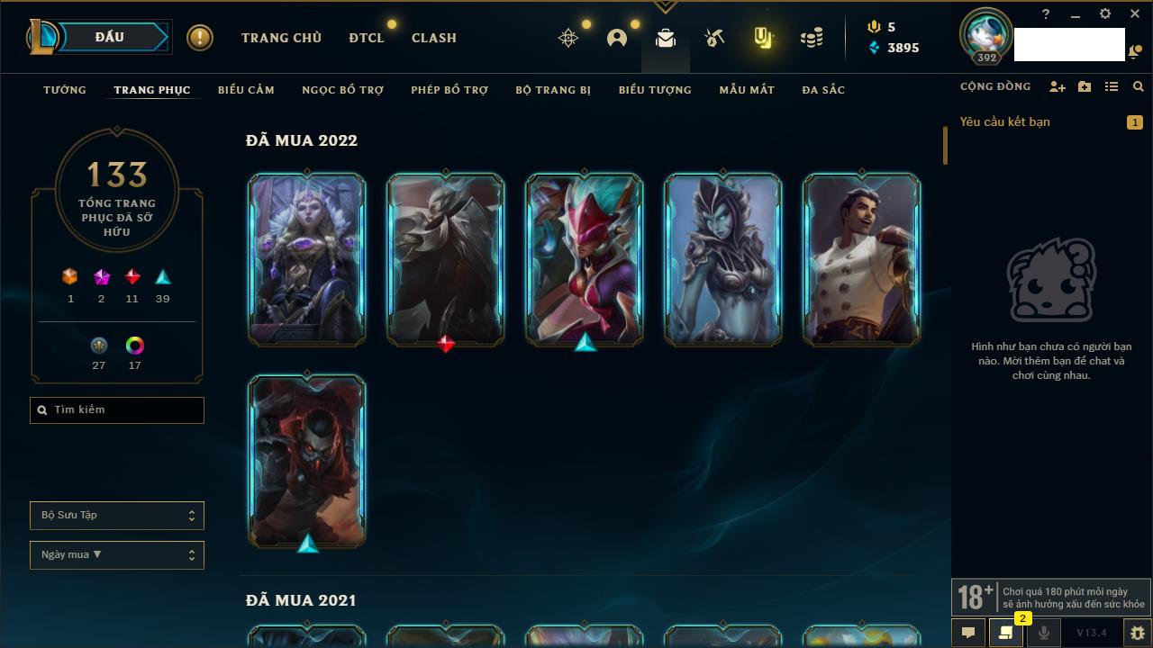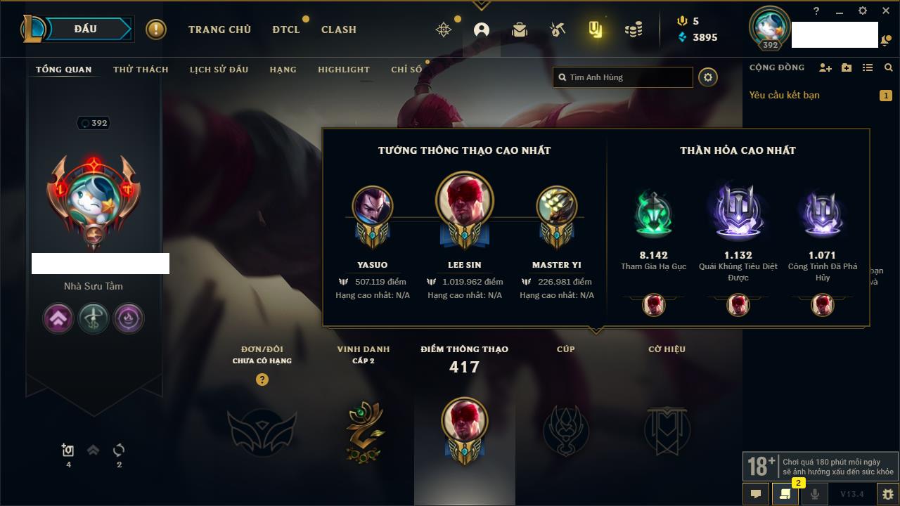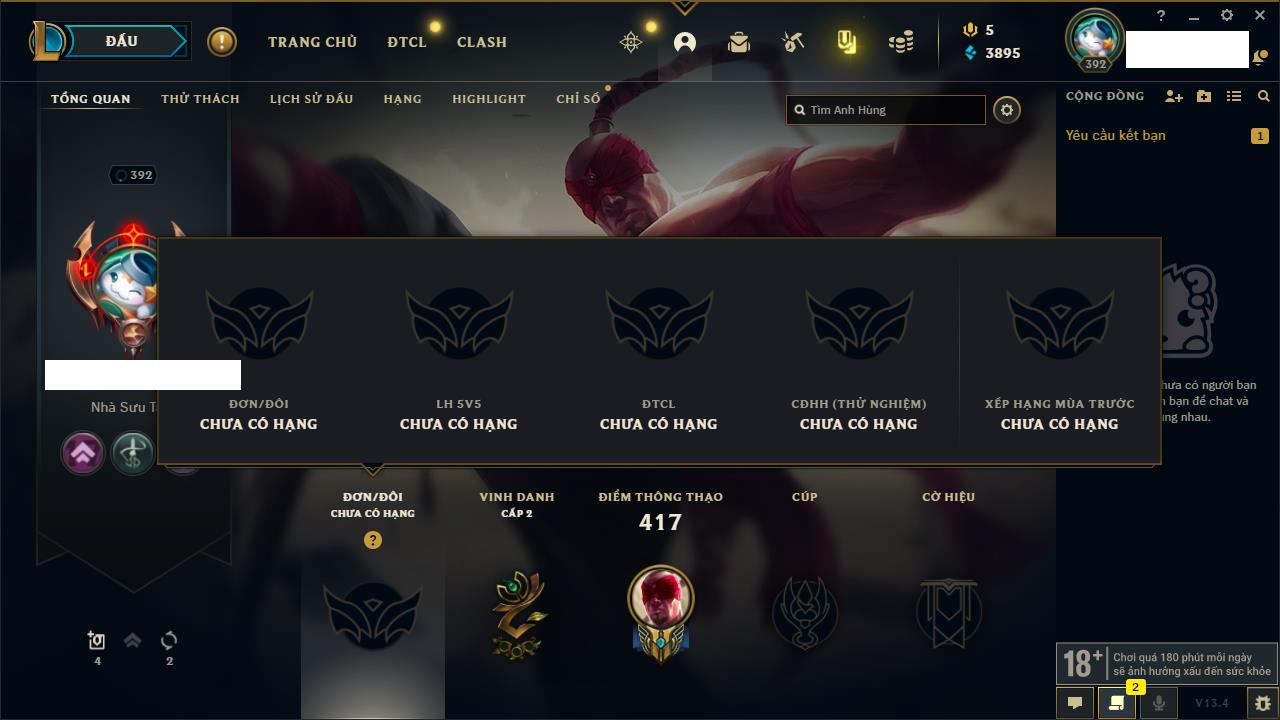 Rank Đơn: Vàng IVKhung: BạcTướng: 171 - Còn 426239 THXTrang Phục: 162Rank ĐTCL: Chưa RankLinh Thú: 33