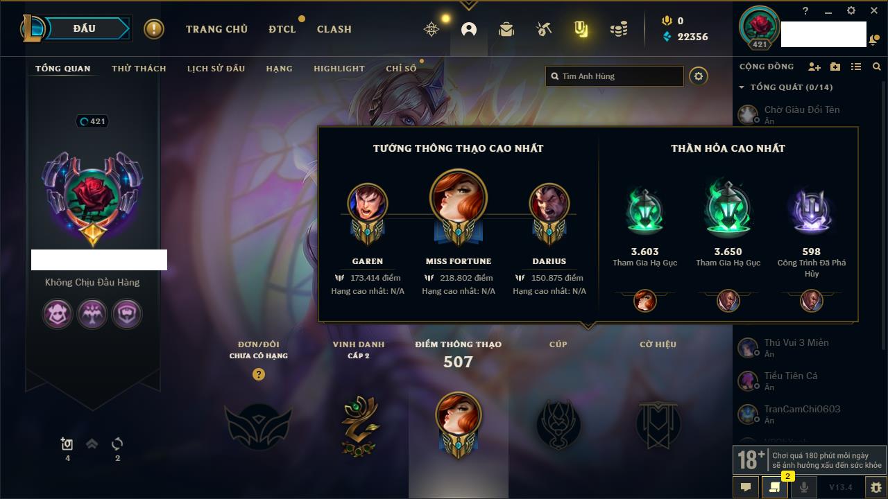 Rank Đơn: Bạc IIIKhung: BạcTướng: 171 - Còn 51045 THXTrang Phục: 220Rank ĐTCL: Sắt IILinh Thú: 141