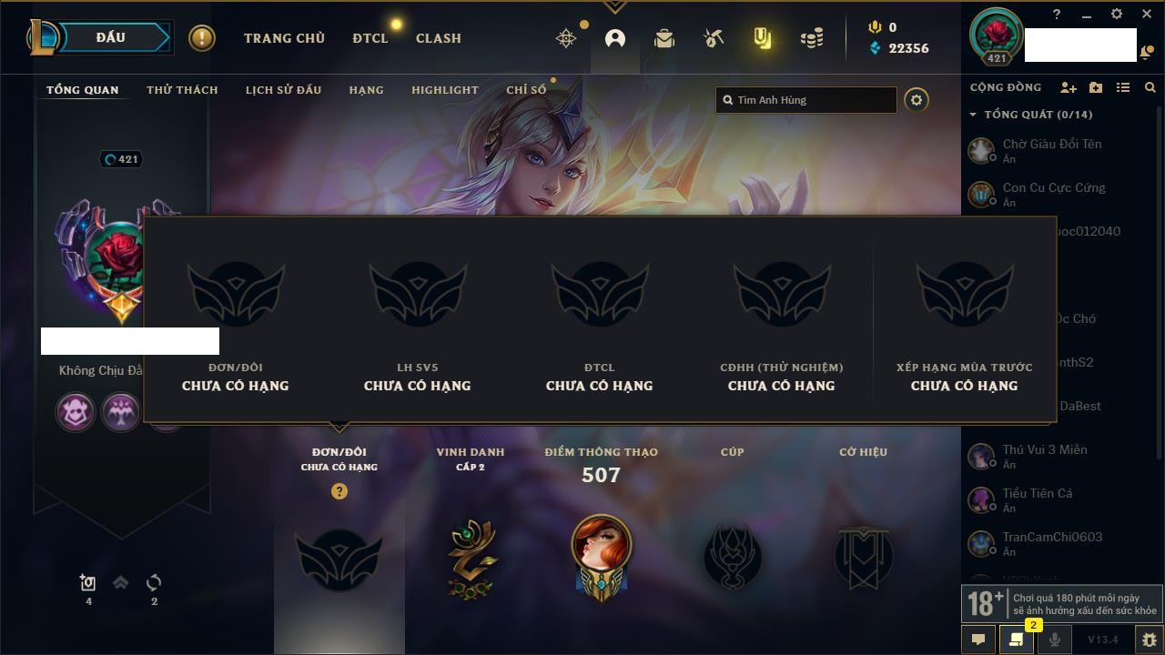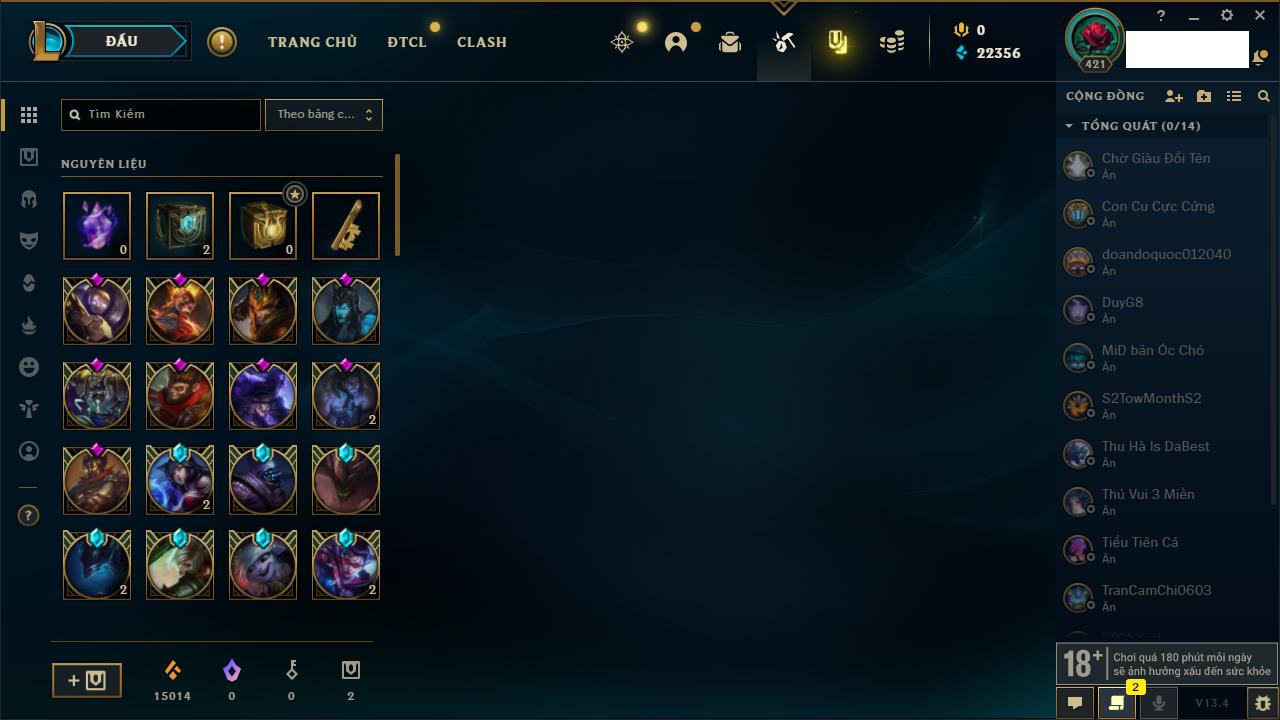 Rank Đơn: Bạch Kim IIKhung: VàngTướng: 171 - Còn 140736 THXTrang Phục: 182Rank ĐTCL: Chưa RankLinh Thú: 14