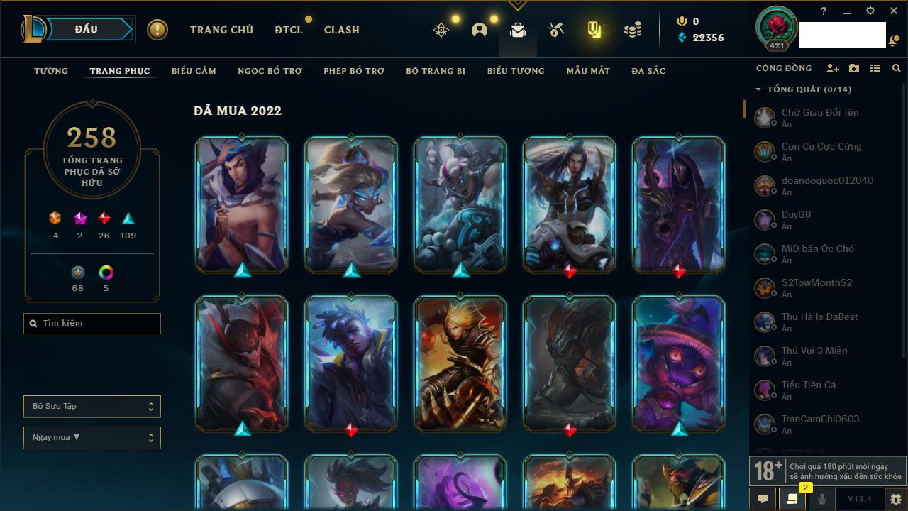 Rank Đơn: Vàng IKhung: VàngTướng: 171 - Còn 117995 THXTrang Phục: 199Rank ĐTCL: Lục Bảo IILinh Thú: 74