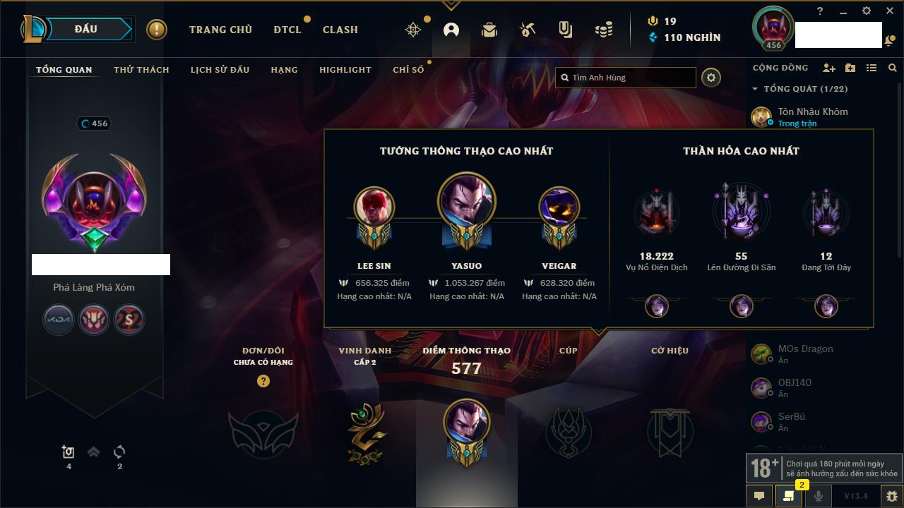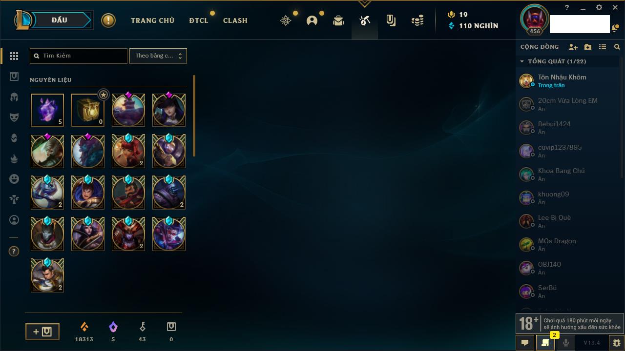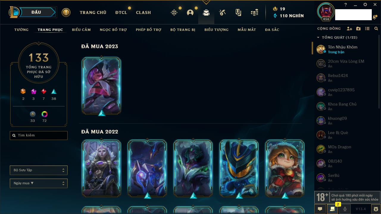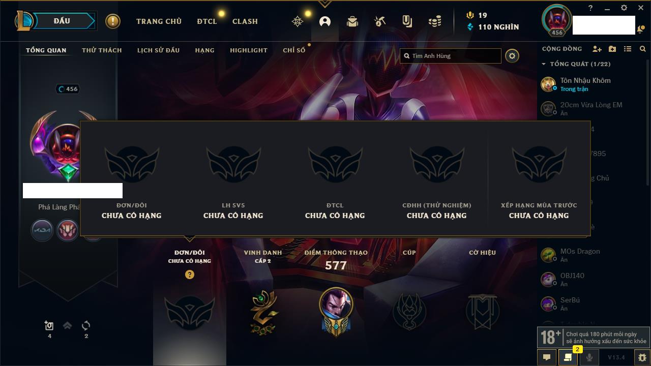 Rank Đơn: Vàng IVKhung: BạcTướng: 171 - Còn 426239 THXTrang Phục: 162Rank ĐTCL: Chưa RankLinh Thú: 33